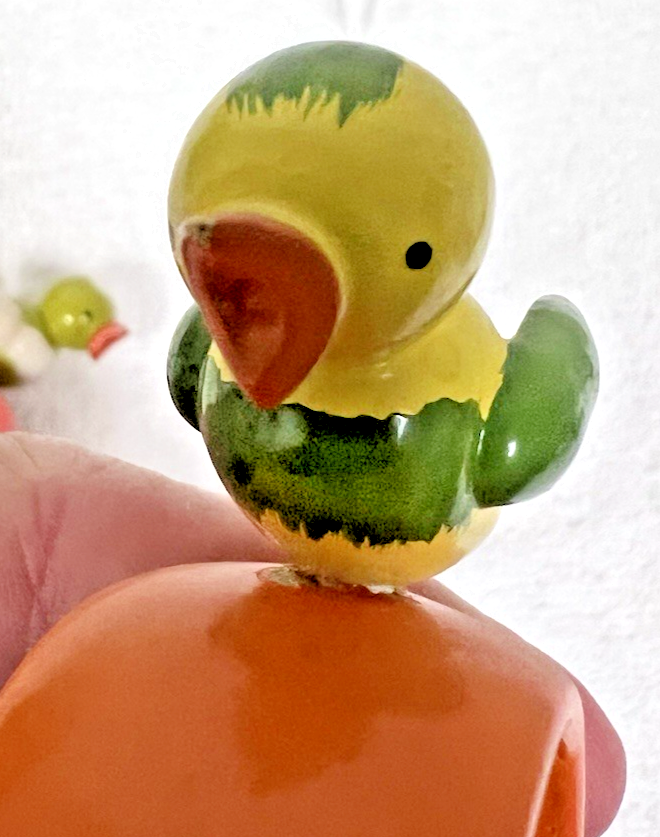 2PC Erzgebirge Style Baby Bird Napkin Ring Holders 3" T Yellow Green Pink In great shape a little paint loss on the darker green ones tail edge. the base is 1.2 inches across and the opening it is just shy of 1 1/4 inches open