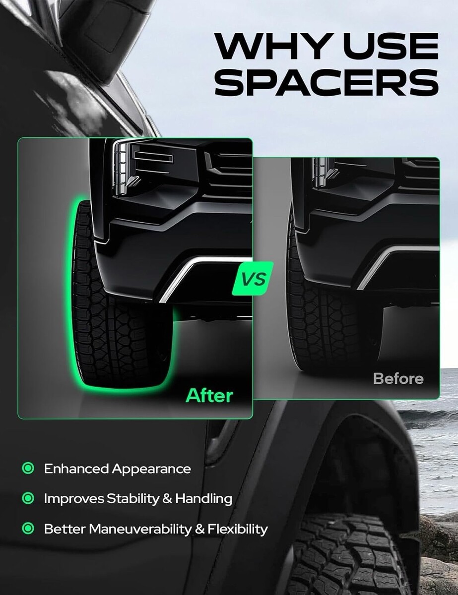 These spacers increase track width for improved stance, stability, and clearance for larger tires.