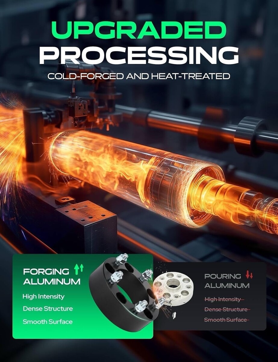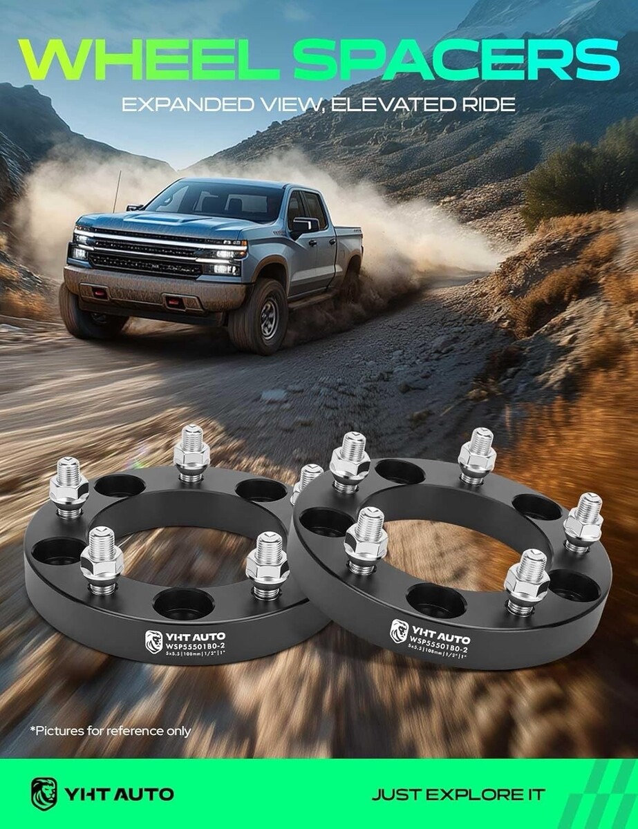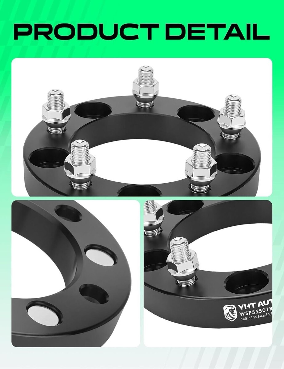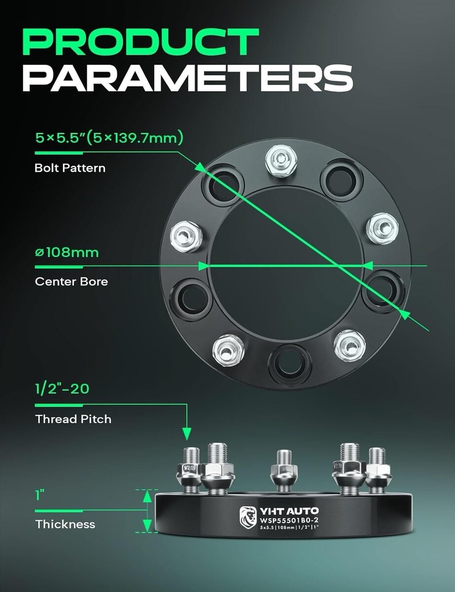 OEM-quality YHTAUTO 1-inch wheel spacers, compatible with popular Ford, Dodge, and Jeep 5x5.5? vehicles. Constructed from CNC-machined 6061-T6 aluminum for strength, heat resistance, and long service life. Upgraded 12.9-grade studs and 10-grade nuts provide superior tensile strength (up to 1200 Mpa).