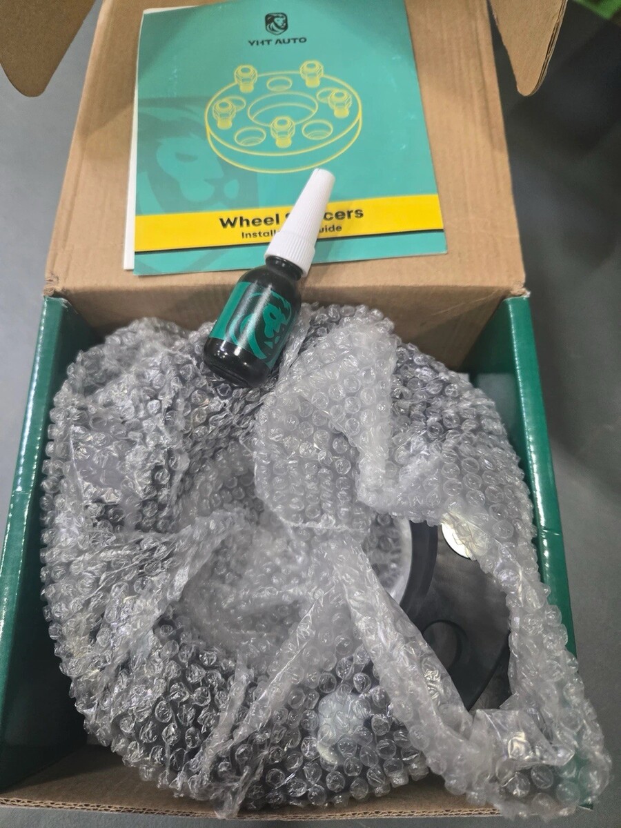 Brand-new, unused wheel spacers in original packaging. Includes: 2 spacers, pre-installed studs, nuts, Loctite bottle, and instruction booklet. Packaging may show light handling wear.