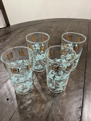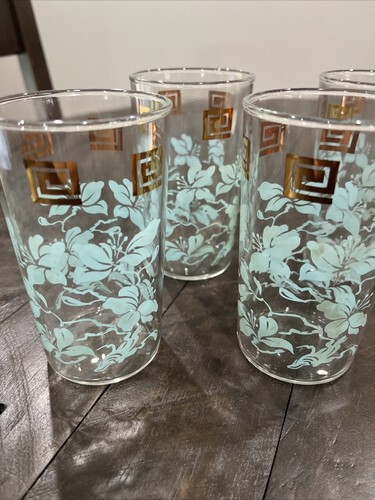 Anchor Hocking Glasses Pale Blue Hibiscus Floral Gold Greek Key Pattern Tumbler.
