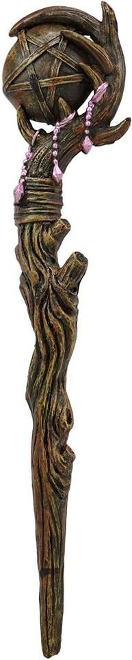 ? These rustic wands are perfect for any Wiccan Priestess. A gnarled brown branch twists around itself, rising from a thin tip. Atop the wand, a large pentagram is emblazoned within the claws of the branch, featuring three rose-tinted charms.