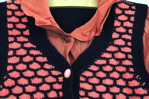 Vintage 1940s girls? hand-knit sweater vest with removable cotton blouse pieces, size 28? chest (approx. child?s 8), crafted in pink and blue yarn with a unique knit pattern. Designed with pearly pink plastic buttons down the front. A charming WWII-era knit, as found in attic storage.