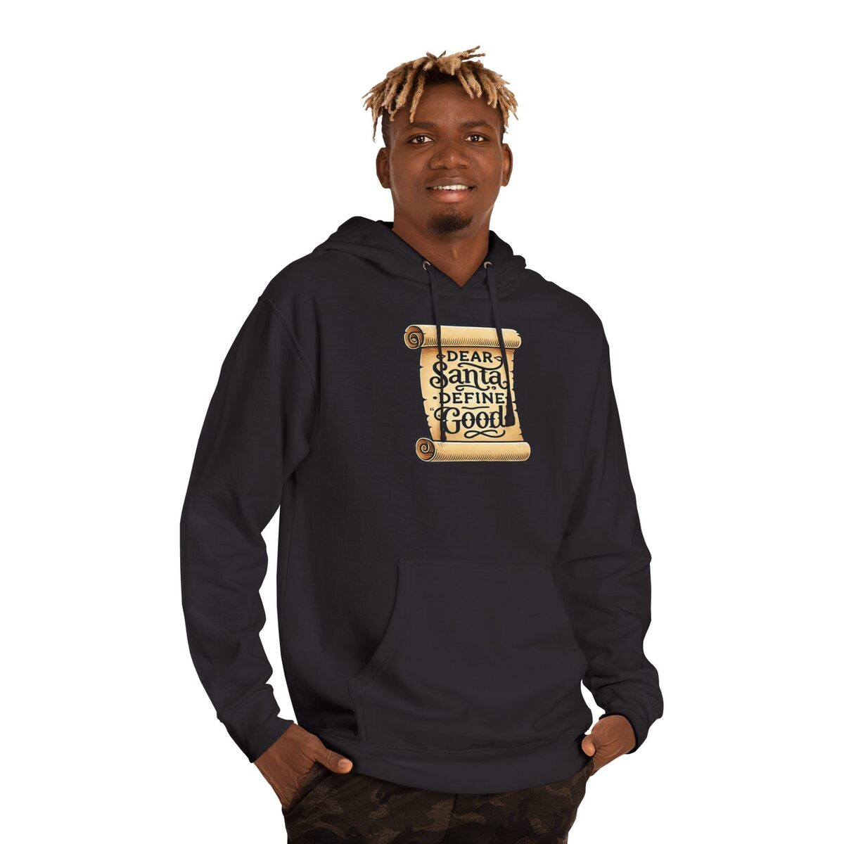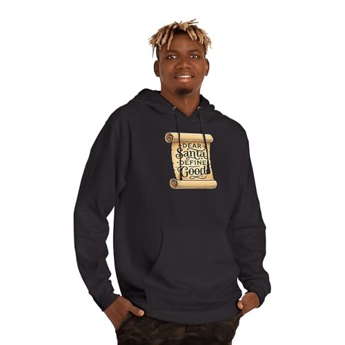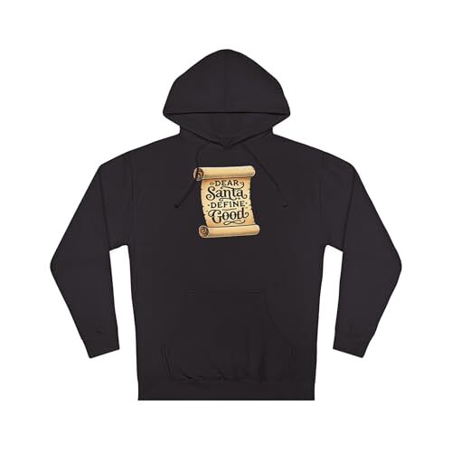 Product description: Slide into a cozy hoodie that reads like a wink to the holiday season. The front features a vintage-style parchment scroll printed with playful lettering ? ?Dear Santa, Define Good? ? that sits small on the chest for low-key, clever charm. The midweight fleece holds warmth without bulk, and the jersey-lined hood and snug ribbed cuffs create that lived-in comfort you reach for on crisp mornings. Wear it while wrapping presents, strolling through twinkling streets, or curled up with cocoa and a stack of classic holiday movies. The design speaks to anyone who loves seasonal humor and subtle, nostalgic graphics that don?t shout but still get a laugh. This hoodie becomes part of quiet holiday rituals: family cookie-baking marathons, late-night gift-wrapping sessions, and casual gatherings around a fire. It pairs naturally with jeans or pajama bottoms and layers easily under a coat for outdoor caroling or market runs. The parchment motif and hand-lettered phrase tap into a retro holiday aesthetic that feels personal and familiar ? like a note passed between friends during festive chaos. Product features - 80% cotton / 20% polyester fleece with 100% cotton face (fiber mix varies by color) - Medium-heavy fabric (8.5 oz /yd) with regular fit - Jersey-lined hood with drawstrings and metal eyelets - Ribbed 1x1 knit cuffs and waistband with double-needle stitched seams - Twill necktape, tear-away label, adult sizing; meets flammability requirements Care instructions - Machine wash: cold (max 30C or 90F) - Do not bleach - Tumble dry: low heat - Do not iron - Do not dryclean