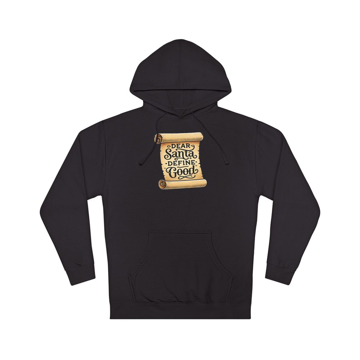 Slide into a cozy hoodie that reads like a wink to the holiday season. The front features a vintage-style parchment scroll printed with playful lettering ? ?Dear Santa, Define Good? ? that sits small on the chest for low-key, clever charm. The midweight fleece holds warmth without bulk, and the jersey-lined hood and snug ribbed cuffs create that lived-in comfort you reach for on crisp mornings. Wear it while wrapping presents, strolling through twinkling streets, or curled up with cocoa and a stack of classic holiday movies. The design speaks to anyone who loves seasonal humor and subtle, nostalgic graphics that don?t shout but still get a laugh. This hoodie becomes part of quiet holiday rituals: family cookie-baking marathons, late-night gift-wrapping sessions, and casual gatherings around a fire. It pairs naturally with jeans or pajama bottoms and layers easily under a coat for outdoor caroling or market runs. The parchment motif and hand-lettered phrase tap into a retro holiday aesthetic that feels personal and familiar ? like a note passed between friends during festive chaos. Product features - 80% cotton / 20% polyester fleece with 100% cotton face (fiber mix varies by color) - Medium-heavy fabric (8.5 oz /yd) with regular fit - Jersey-lined hood with drawstrings and metal eyelets - Ribbed 1x1 knit cuffs and waistband with double-needle stitched seams - Twill necktape, tear-away label, adult sizing; meets flammability requirements Care instructions - Machine wash: cold (max 30C or 90F) - Do not bleach - Tumble dry: low heat - Do not iron - Do not dryclean