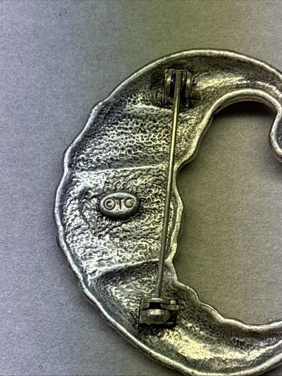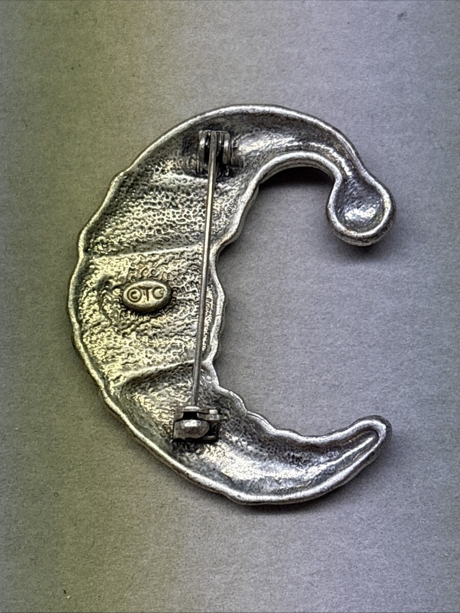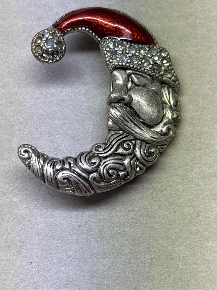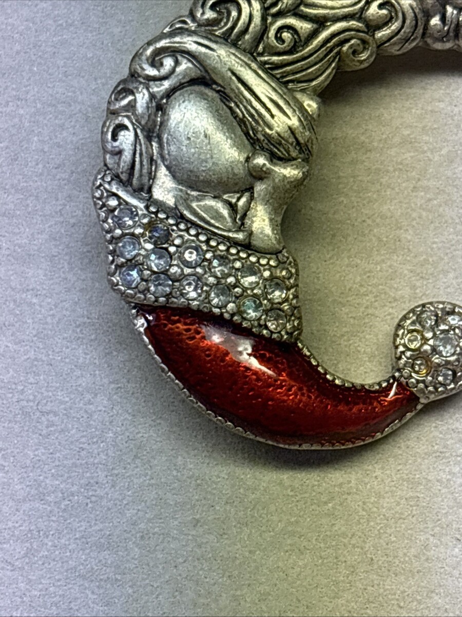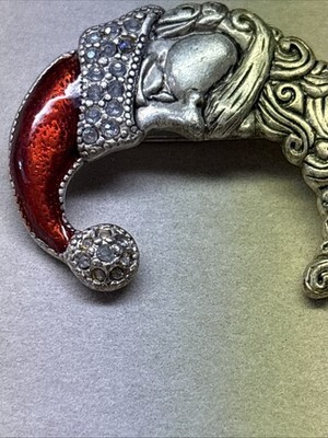 Vintage TC Brand Pewter Brooch Santa Face Crescent Moon Rhinestone/Enamel Pin