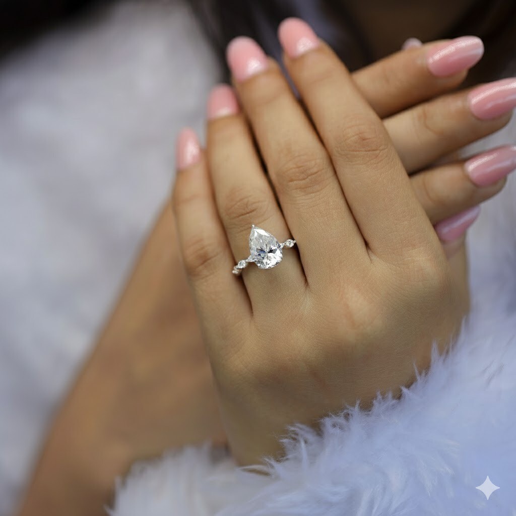 Celebrate timeless elegance with this Handmade 4 Carat Pear Cut Lab Grown Diamond Engagement Ring, exquisitely designed for modern brides who love bold brilliance with refined luxury. Featuring a stunning pear-shaped lab grown diamond graded F color and VS1 clarity, this ring delivers exceptional sparkle, fire, and an elongated silhouette that flatters the hand beautifully.