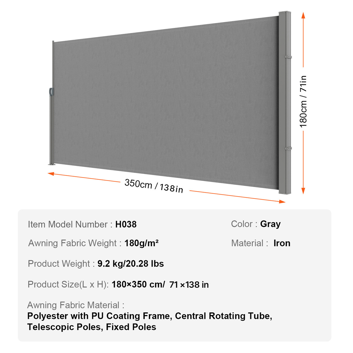 VEVOR Retractable Side Awning, 71''x 138'', 180g Polyester Water-proof, Gray