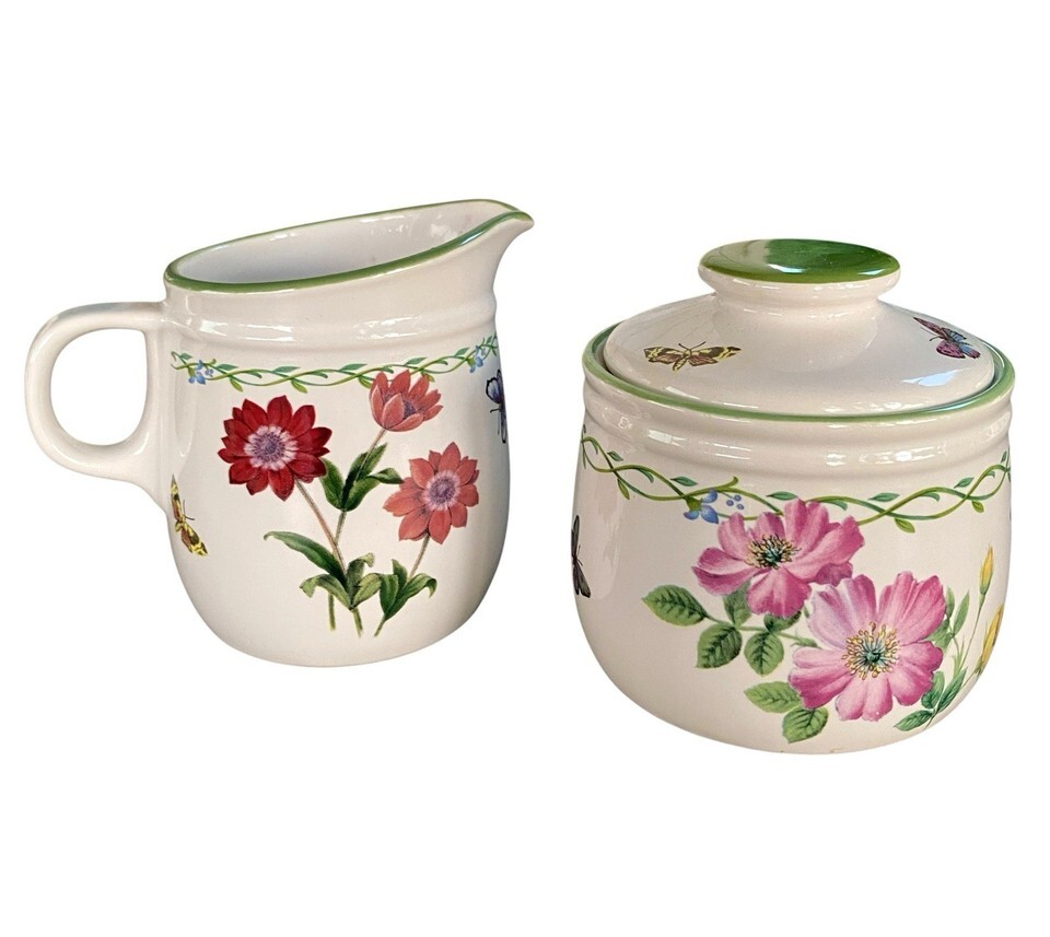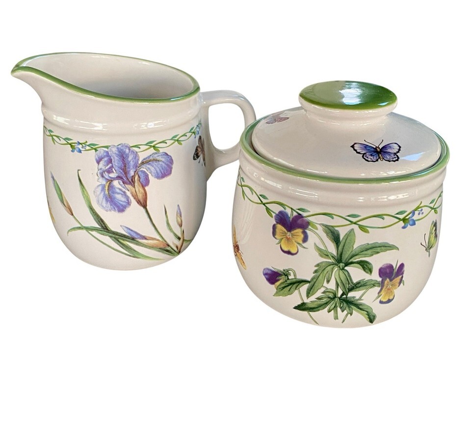 Studio Nova Sugar Bowl snd Creamer Set Garden Bloom Butterflies Iris Green Trim