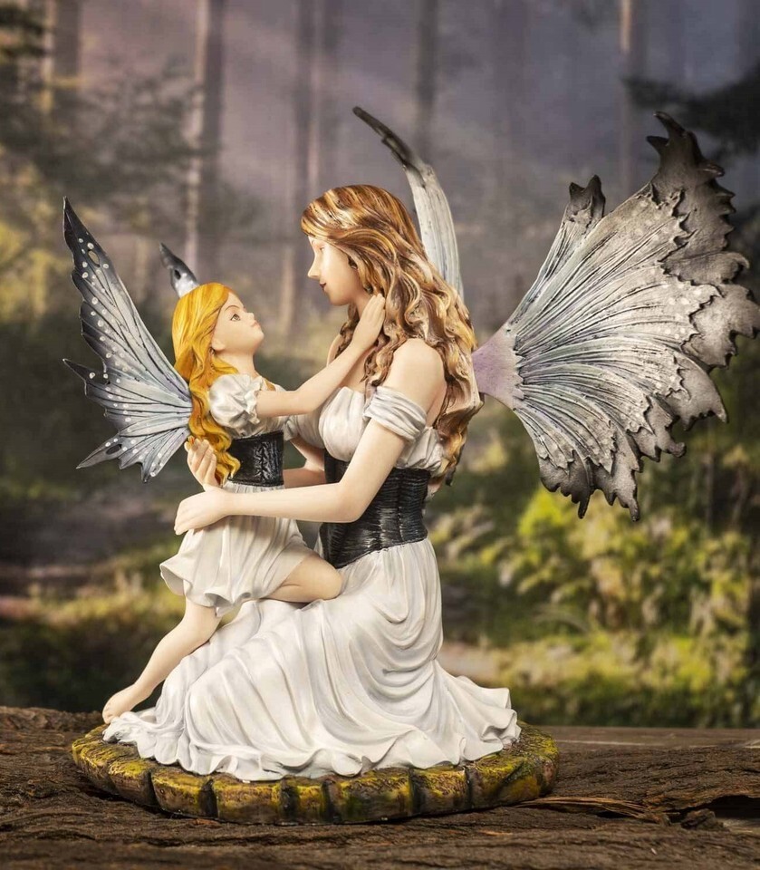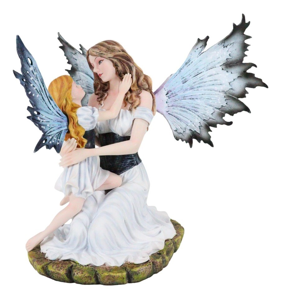 ? A sweet celebration of the love between mother and child! This beautiful figurine features two fairies, a mom and daughter. The pixie pair gaze at one another, sharing a tender moment in a peaceful forest glade. They wear matching white dresses with corsets and have fluttering butterfly wings. An excellent gift for Mother's Day, or any other time you want to show appreciation for the maternal figures in your life!