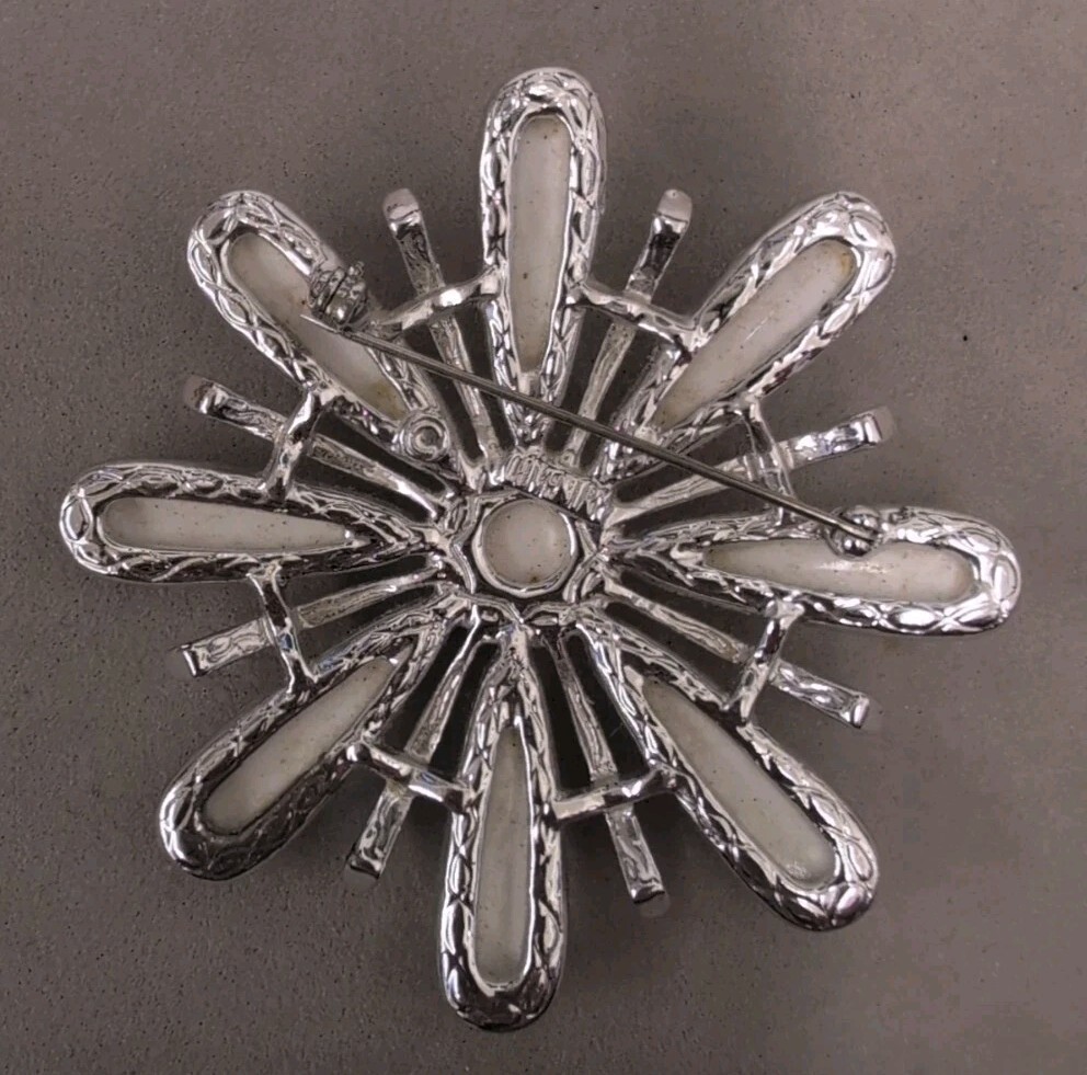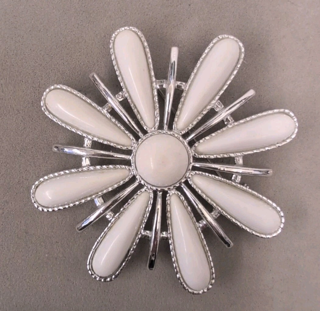 Vintage costume jewelry by Sarah Coventry. 1973 Snow blossom flower brooch pen in silvertone base metal with white plastic insets. 2.75 in across. Signed on the back. No smoke or pet odor.