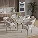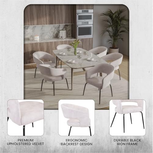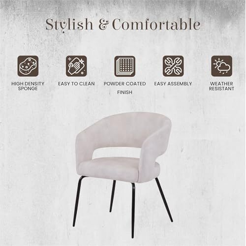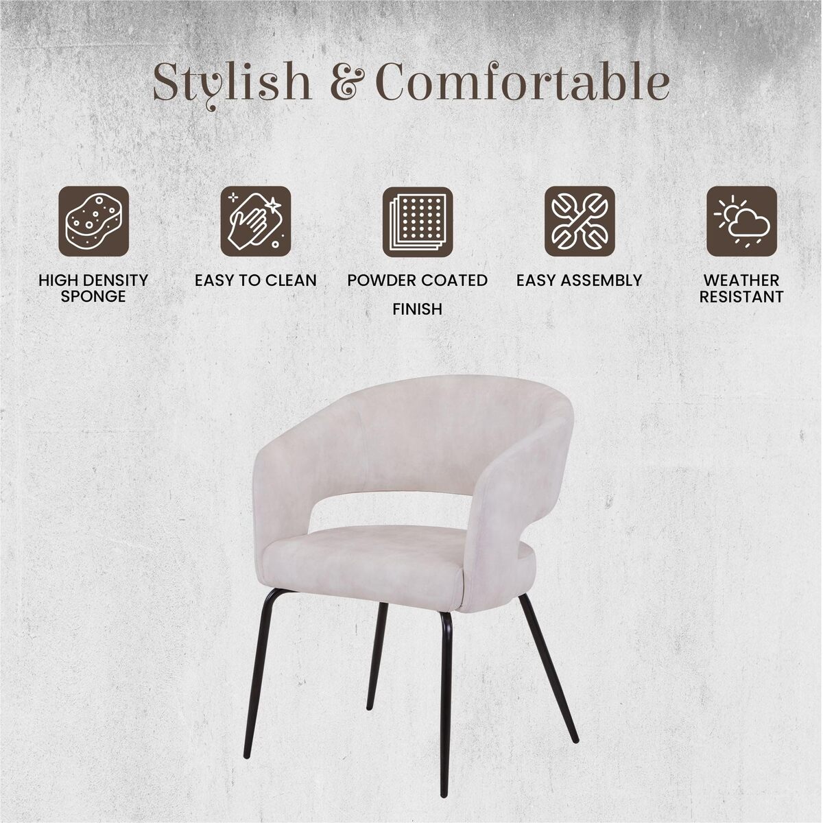 Bullet point: [OPEN BACK DESIGN] The dining chair showcases a sleek wraparound design with an open back, creating a contemporary and stylish look. The curved backrest extends to the sides, providing support for both the back and arms. The open-back design enhances airflow, ensuring a cool and comfortable seating experience whether you're dining, working, or relaxing.