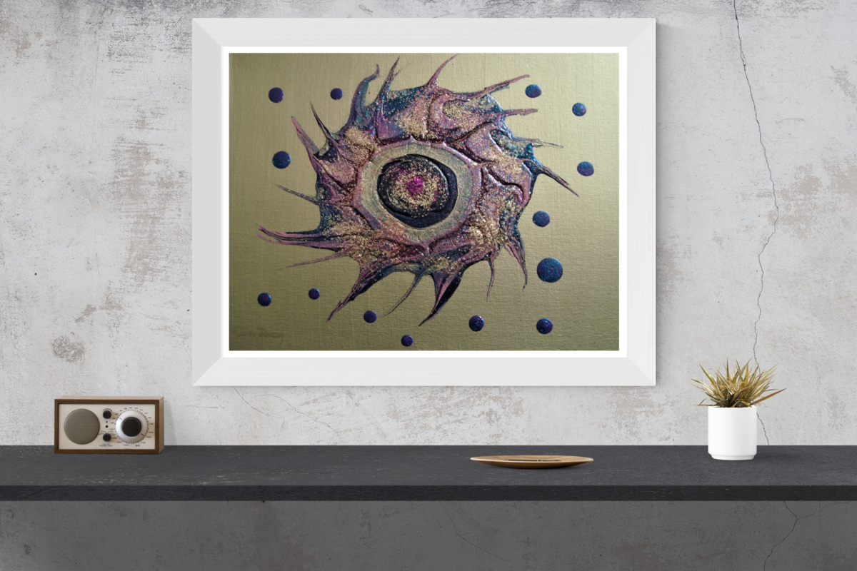 Titled 'Blue Purple Star.' This is an original mixed media acrylic and glitter painting on an 11" x 14" strong, durable, child and pet friendly canvas board. The background is a metallic silver color. The artwork has two coats of high gloss protective varnish for long lasting protection. The painting is titled and signed on the back as well as signed on the front lower left hand corner. It really looks great in the sunlight and would look good hung in any sunny location. Unframed but the painting comes with a hanger attached so you can hang it with or without a frame.