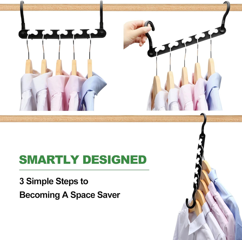Durable Closet Organizer: Closet storage hangers maximize closet space, there are 5 slots to hold 10 clothes horizontally or 5 clothes vertically, and each wardrobe closet hangers support up to 30 lbs, simple and easy to use, no assembly required. There are no burrs or sharp edges, so don't worry about damaging, or creasing your clothes. Fits most clothes hangers: wire, plastic, or wooden hangers, is an excellent home organization tool that will help maximize the space of your closets