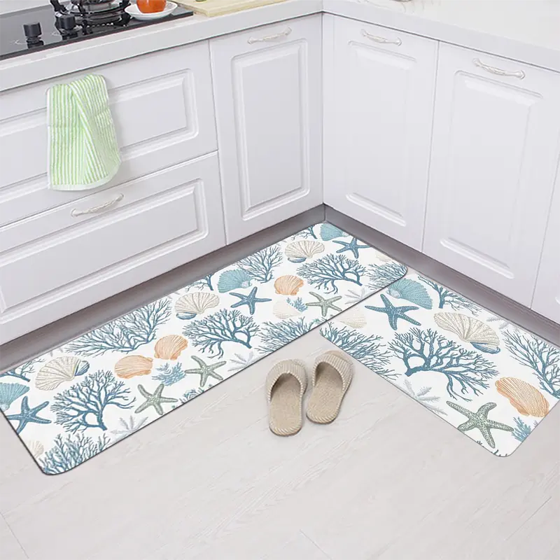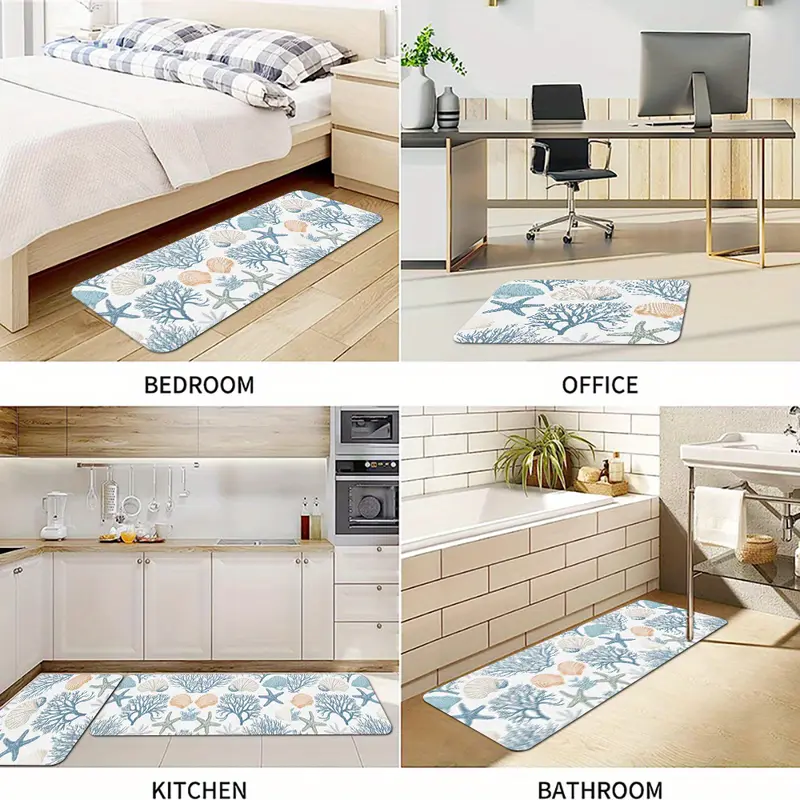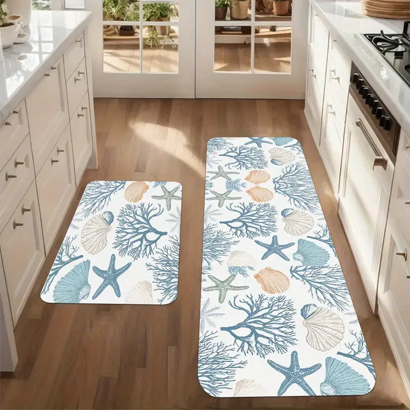 This product is a set of 2 bathroom kitchen mats featuring a starfish seashell design, perfect for coastal home decor.