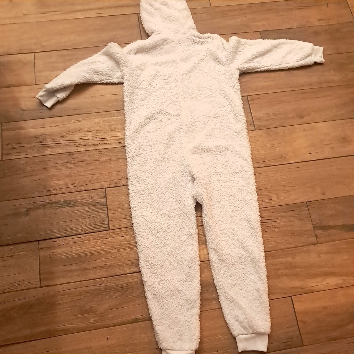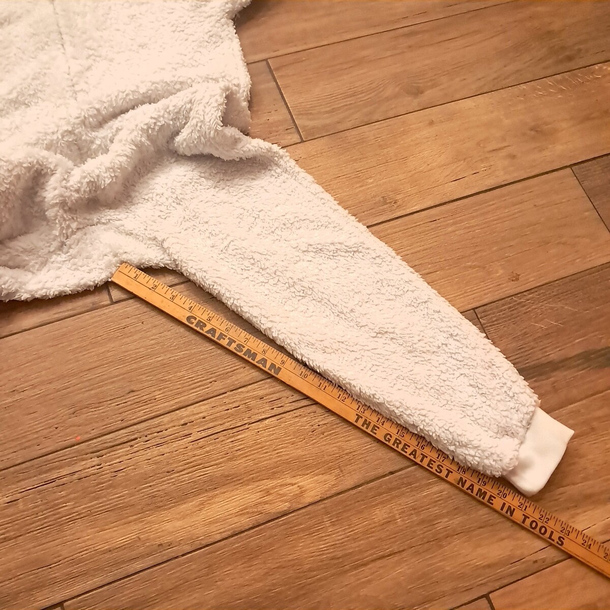 One piece with zipper closure. Hooded. Sherpa type material. Sherpa has wear/matting from being used and washed as shown. See pics. Measurements in photos.