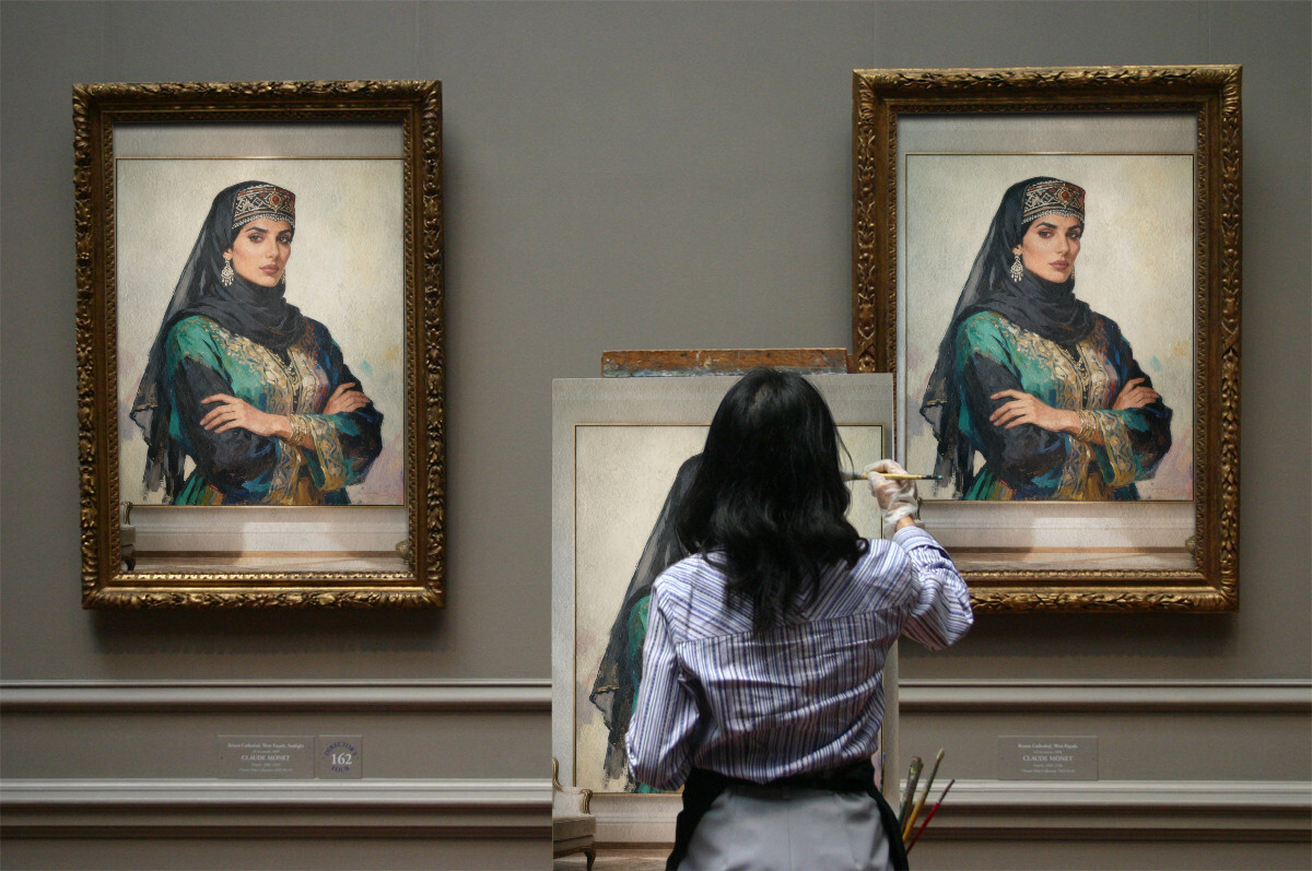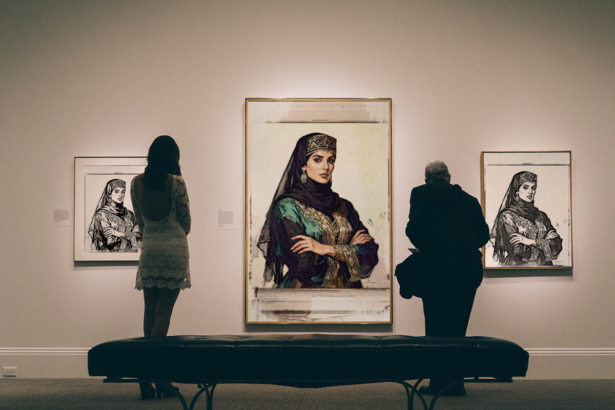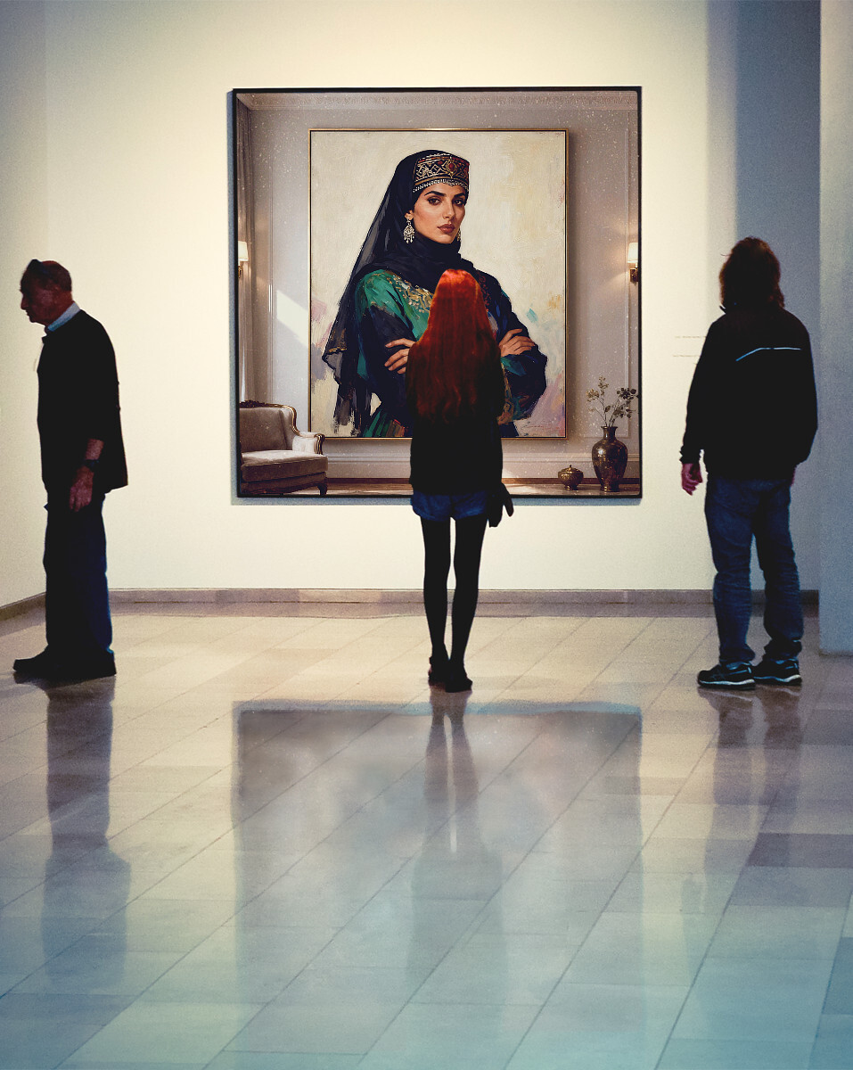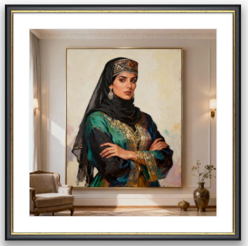 This artwork reflects identity, belonging, and pride in Arab and Islamic heritage, with the woman as a symbol of honor, grace, and authentic spirit. It can be seen as a dialogue between tradition and modernity, where classical portrait aesthetics meet contemporary digital art, showing that values can remain timeless even as styles evolve.