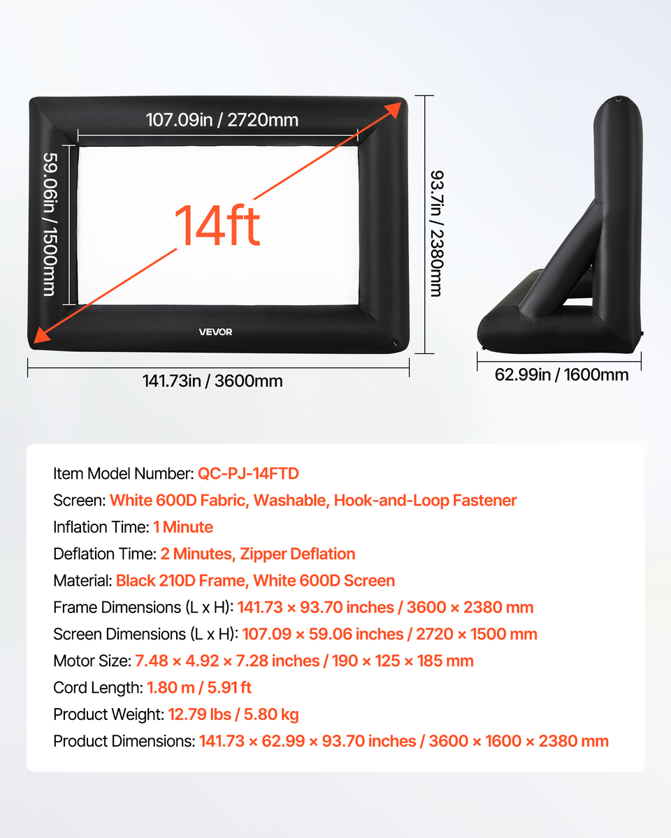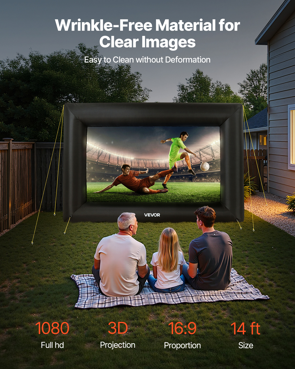 High-quality Material: This inflatable projector screen for outside uses high-quality Oxford fabric, which can resist creases and is easy to clean, ensuring clear, high-resolution images every time. The screen size is 8.92 x 4.92 ft. Front and rear projection are available with an aspect ratio of 16:9
