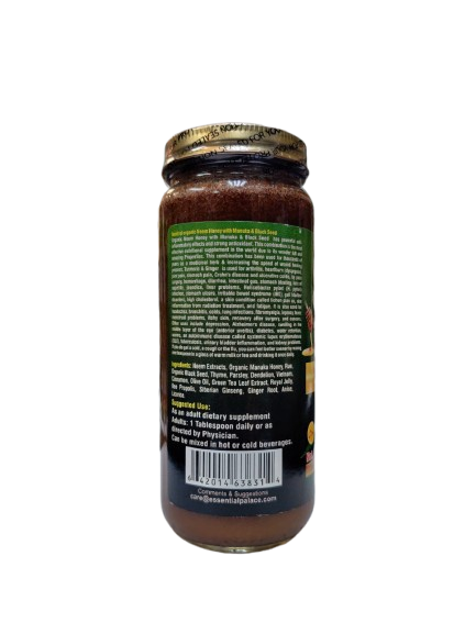 Organic Neem Honey with Manuka Black Seed has powerful anti-inflammatory effects and strong antioxidant. This combination is the most effective nutritional supplement in the world due to its wonder full and amazing Properties. This combination has been used for thousands of years as a medicinal herb increasing the speed of wound healing process. It is used for arthritis, heartburn (dyspepsia), joint pain, stomach pain, Crohn's disease and ulcerative colitis, by pass surgery, hemorrhage, diarrhea, intestinal gas, stomach bloating, loss of appetite, jaundice, liver problems, Helicobacter pylori (H. pylori) infection, stomach ulcers, irritable bowel syndrome (IBS), gall bladder disorders, high cholesterol, a skin condition called lichen plan us, skin inflammation from radiation treatment, and fatigue. It is also used for headaches, bronchitis, colds, lung infections, fibromyalgia, leprosy, fever, menstrual problems, itchy skin, recovery after surgery, and cancers. Other uses include depression, Alzheimer's disease, swelling in the middle layer of the eye (anterior uveitis), diabetes, water retention, worms, an autoimmune disease called systemic lupus erythematosus (SLE), tuberculosis, urinary bladder inflammation, and kidney problems. If you do get a cold, a cough or the flu, you can feel better sooner by mixing one teaspoon in a glass of warm milk or tea and drinking it once daily.