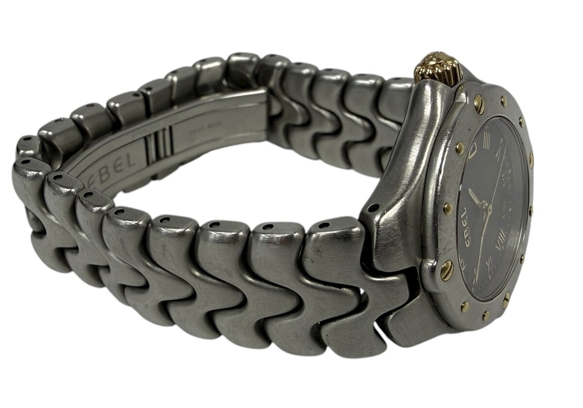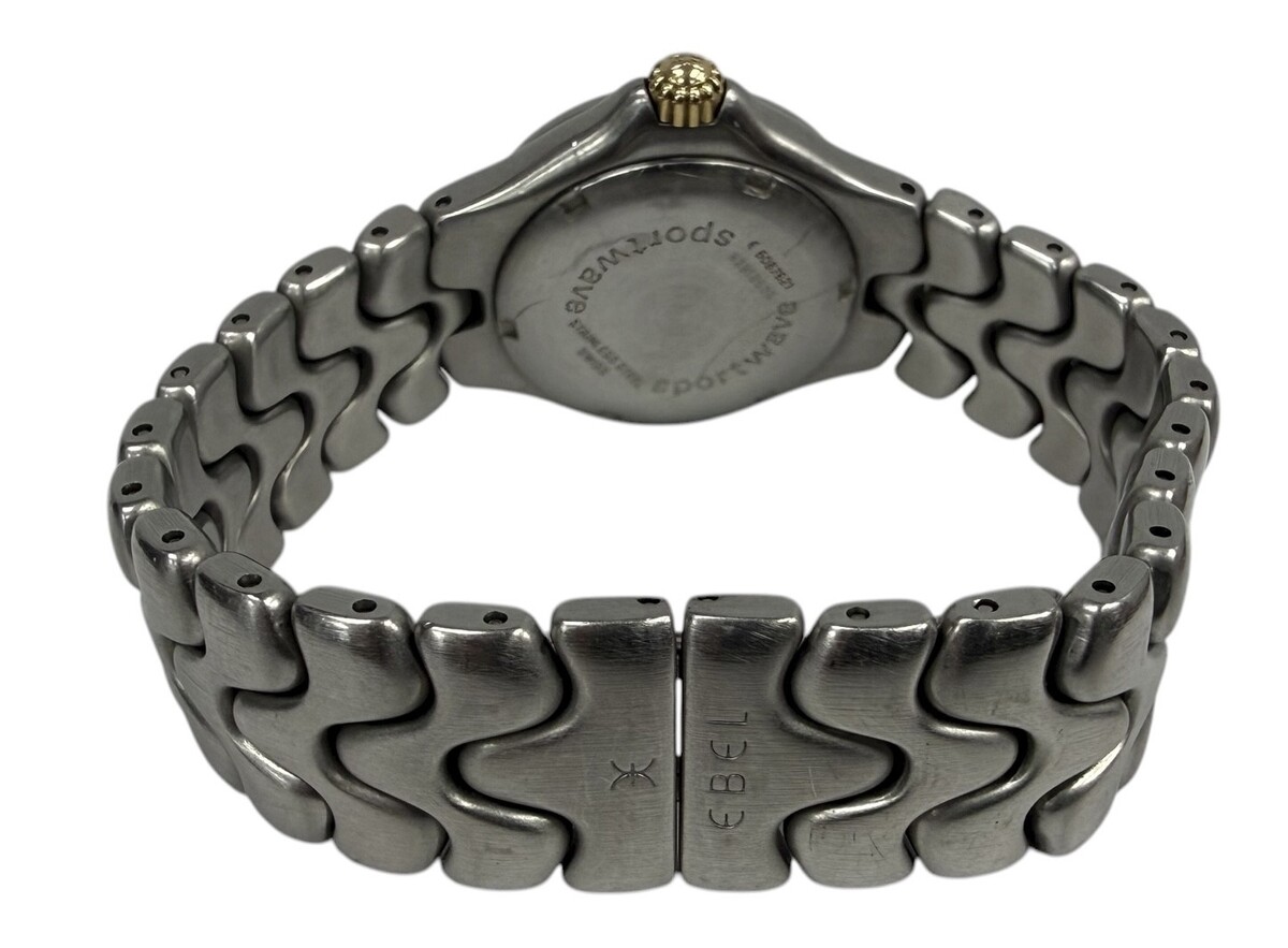 Type: Wrist watchBrand: EbelModel number: e6087621 SportwaveModel name: Sportwave LadiesCase width: 28mmWeight: 53.0Bracelet length: 7"Movement type: Quartz (Battery)Case Material: Stainless SteelBox included: noPaperwork included: noRunning: yesDial color: BlackCondition:Used