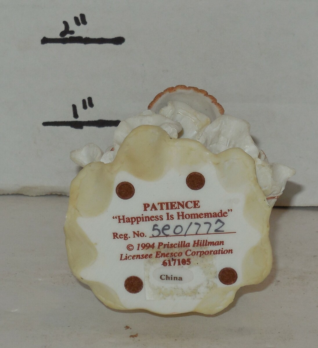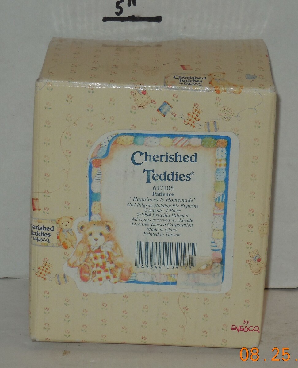 For Sale is a Cherished Teddies PATIENCE "HAPPINESS IS HOMEMADE" 1994 #617105 By Enesco. it in good condition as seen in the pictures provided what you see is what you will receive. Please ask Any and All Questions prior to purchasing. Fast Same or Next day shipping with Free Delivery Confirmation within the U.S. Payment Due within 7 days of purchase (if you need more time please let us know In advance) we love to combine shipping is always a Yes and Most of the time Additional Items Ship for free.