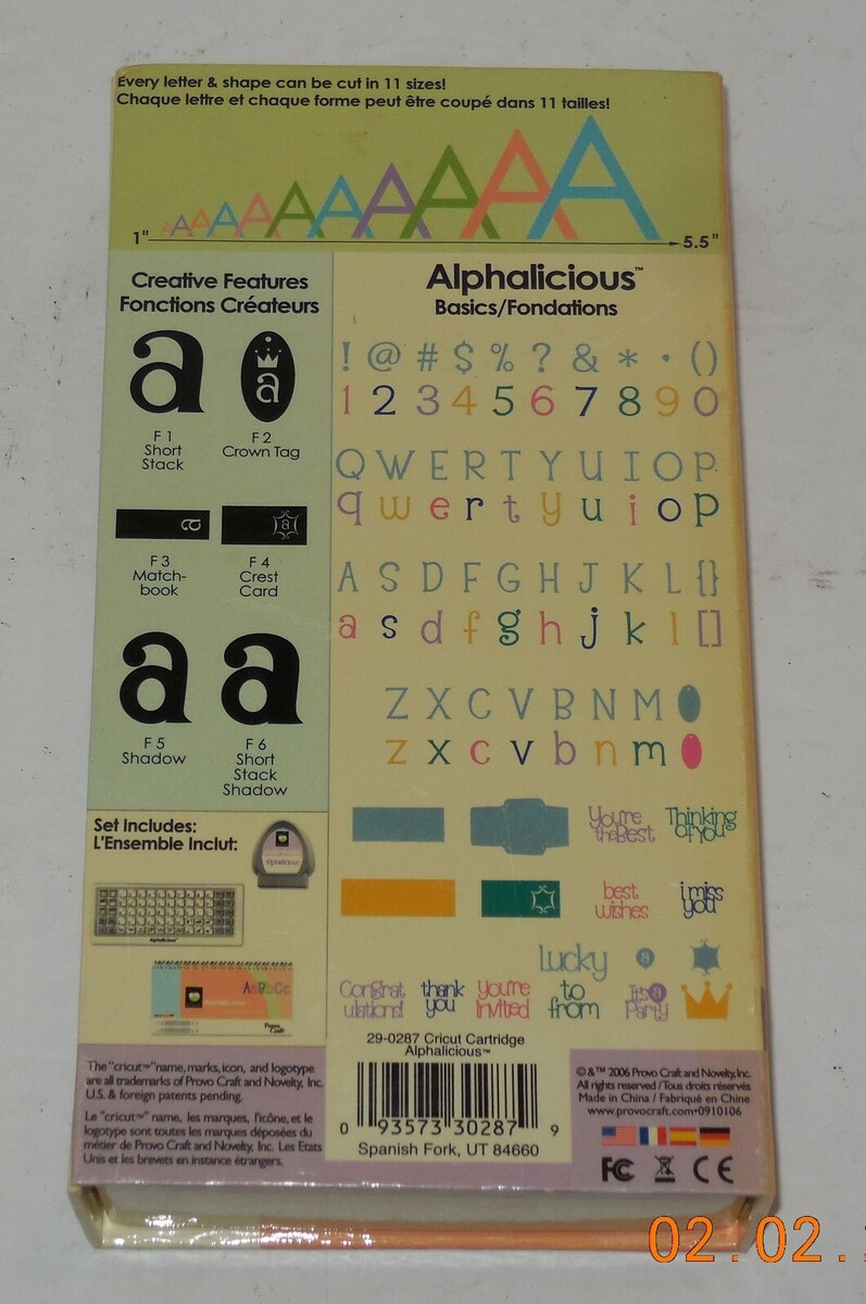 For Sale is a Provo Craft Cricut Alphalicious Cartridge Retired Complete In Box 29-0287. it in good condition as seen in the pictures provided what you see is what you will receive. Please note You can still use those cartridges with stand-alone machines like Expression, Personal, etc. Even if the cartage is linked to an account (but not with a computer or device (phones and tablets) ). Please ask Any and All Questions prior to purchasing. Fast Same or Next day shipping with Free Delivery Confirmation within the U.S. Payment Due within 7 days of purchase (if you need more time please let us know In advance) we love to combine shipping is always a Yes and Most of the time Additional Items Ship for free.