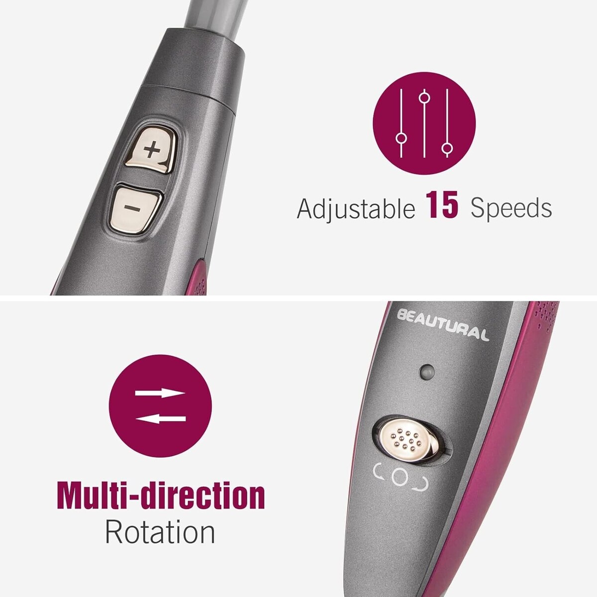 Powerful and Adjustable: Experience the power of a professional nail drill with fifteen adjustable speed settings ranging from 2,000 to 4,600 RPM. The flexibility of clockwise and anti-clockwise rotation caters to various angles, allowing you to achieve salon-quality manicures and pedicures right in your own home.