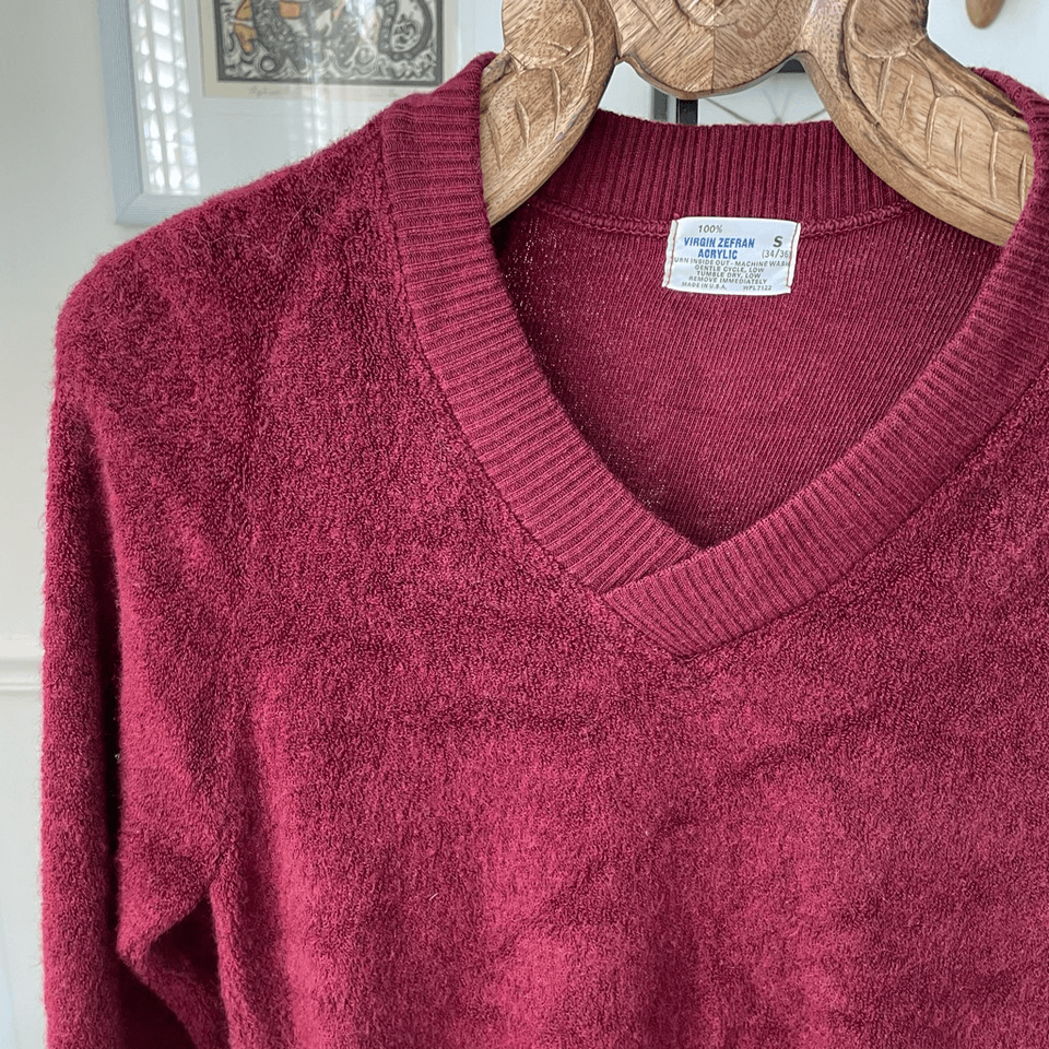 Vintage 70s 80s Men’s Unisex Terrycloth Vneck Pullover Burgundy XS S