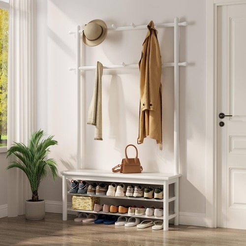[Sturdy and Safe] Made with high quality MDF and solid wood, this hall tree guarantees long-term satisfaction and durability. Each hook can hold up to 5 pounds, while each top open shelf holds up to 30 pounds and the shoe bench up to 250 pounds.