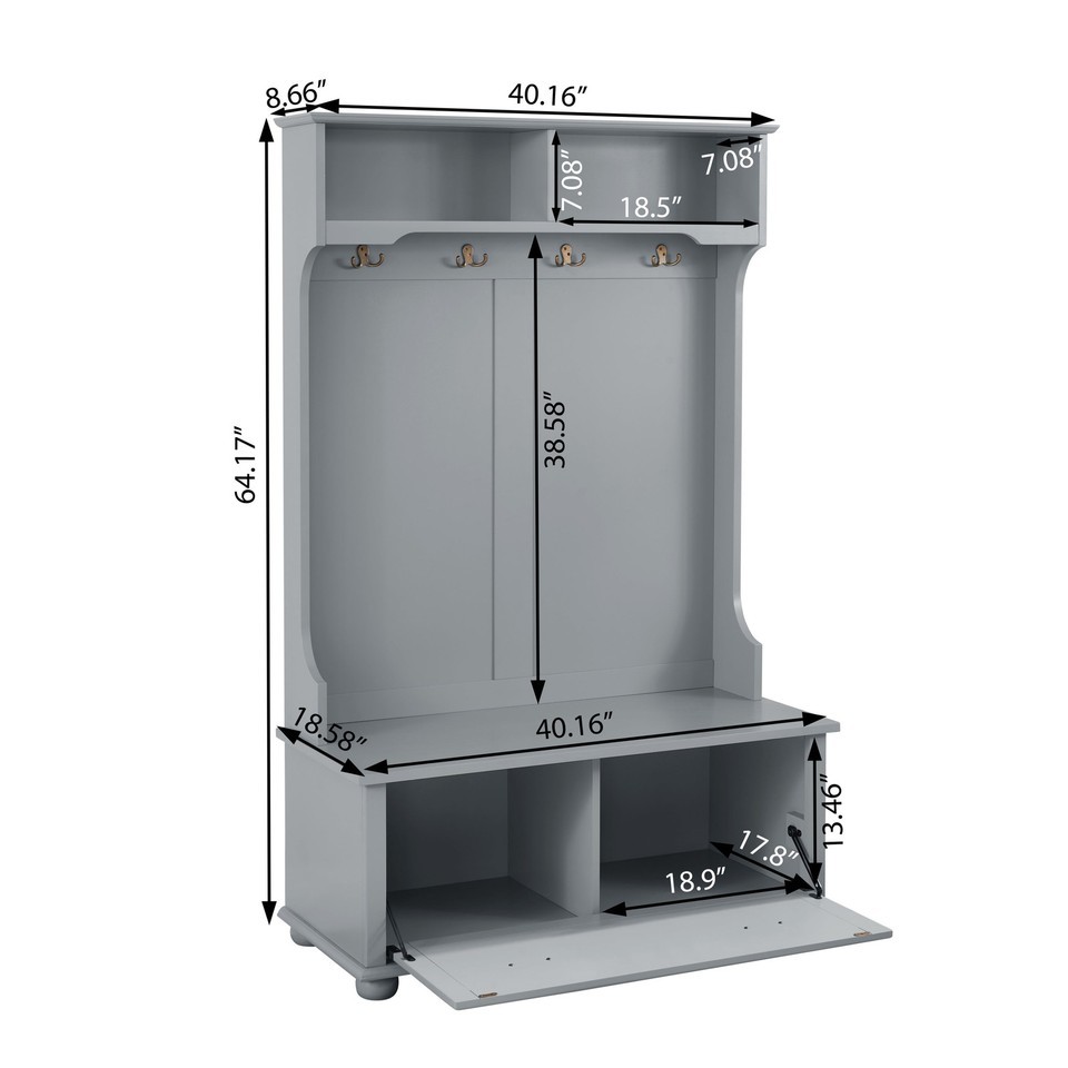 [Dimensions] Hall tree dimensions: 40.16'' L x 18.58''W x 64.17''H. Net weight: 89.76 lbs. Package dimensions: 52''L x 21.4''W x 8.2''H. Gross Weight: 93.7 lbs.