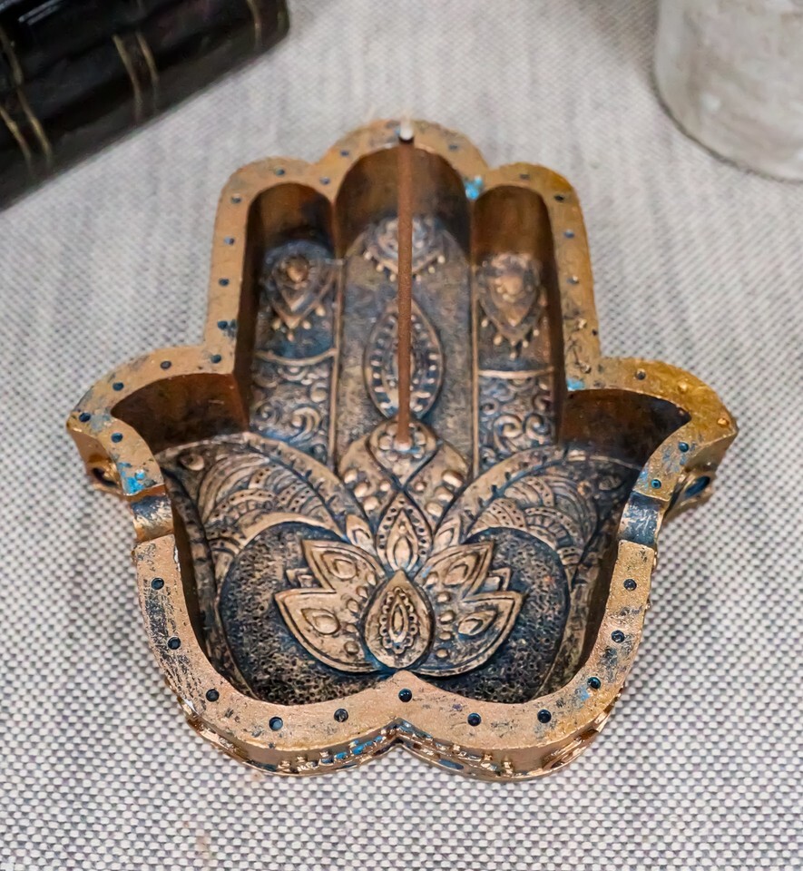 ? This Hamsa incense holder is a symbol of protection from the evil eye, representing the hand of God, believed to promote health, happiness, good luck and fortune. Hand painted in copper color, burning incense on this dish brings the spiritual significance of the Hamsa in aesthetic style.