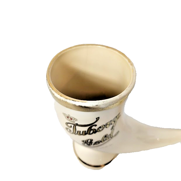 This product is a set of three ceramic beer mugs with a unique horn design, 2 featuring gold trim and all advertising the Distillery theme. The mugs showcase 2 different colors and each is an original piece of advertising collectible. The Tuborg and Tuborg Gold Horn beer mugs are not only functional barware and/or display pieces but also serve as stylish decor for any home or bar. Ideal for collectors or enthusiasts of vintage distillery advertising.