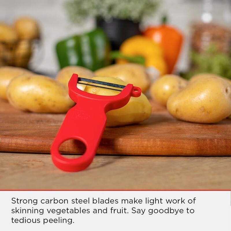 Launched in 1986, the Original Swiss Peeler by KUHN RIKON has sold over 20 million units worldwide, earning a reputation for superior performance and unbeatable value. Proudly made in Switzerland, this iconic Y-shaped peeler combines lightweight design with razor-sharp carbon steel blades that tackle a wide variety of fruits, vegetables, and potatoes with ease. Whether you?re a home cook or professional chef, this versatile tool makes prep work faster and smoother, reducing waste while effortlessly handling both soft and hard produce. Each peeler features an integrated potato eye remover and an ergonomic design that fits comfortably in both right- and left-handed hands. This three-pack of Original Swiss Peelers comes in vibrant red, green, and yellow handles, making them easy to identify and a colorful addition to your kitchen. Perfect for everyday cooking or behind the bar, these peelers can effortlessly slice citrus for cocktails or garnish salads with precision. Trusted for decades, durable, and ultra-sharp, the KUHN RIKON Swiss Peeler is the ultimate kitchen essential.