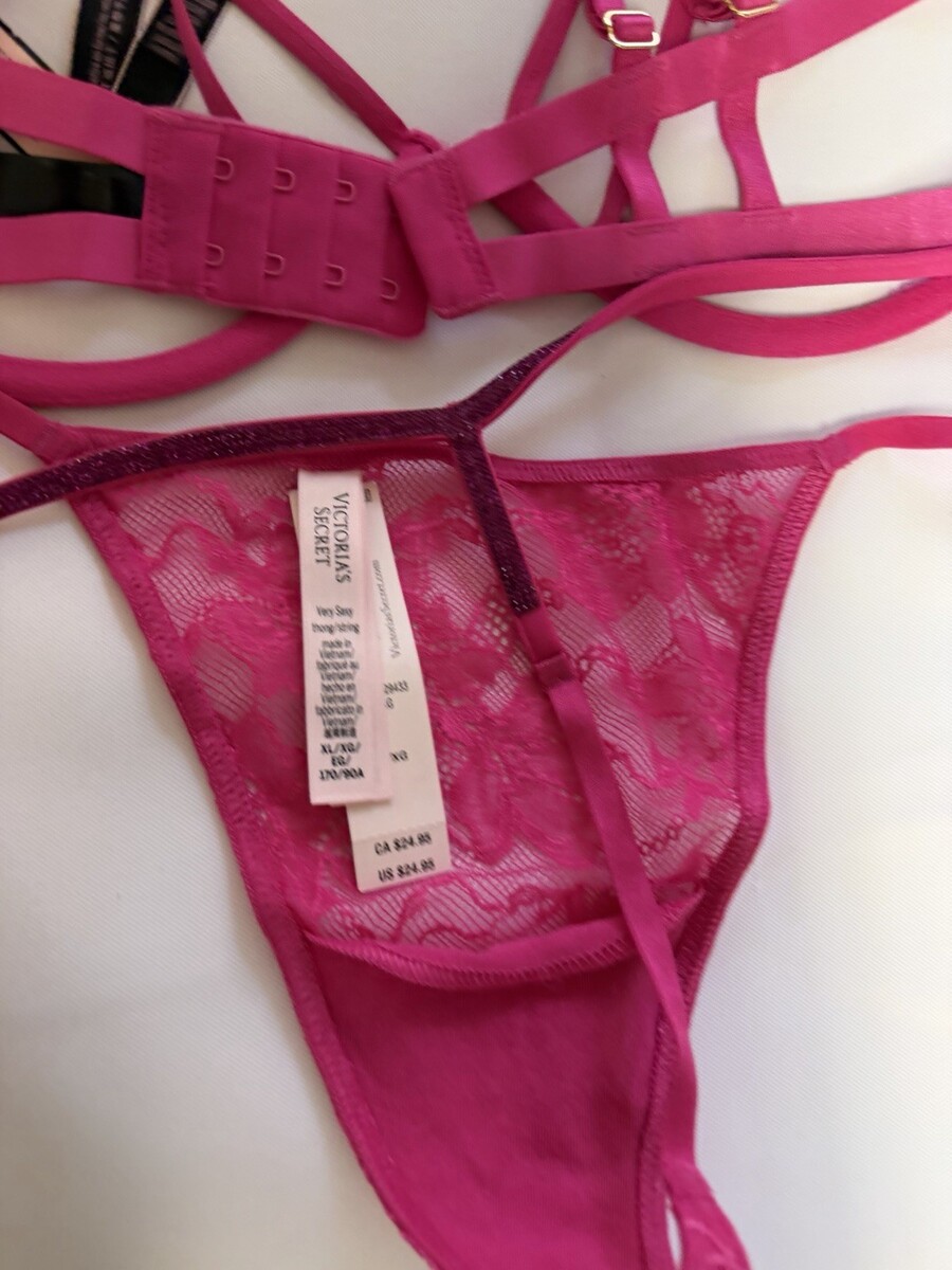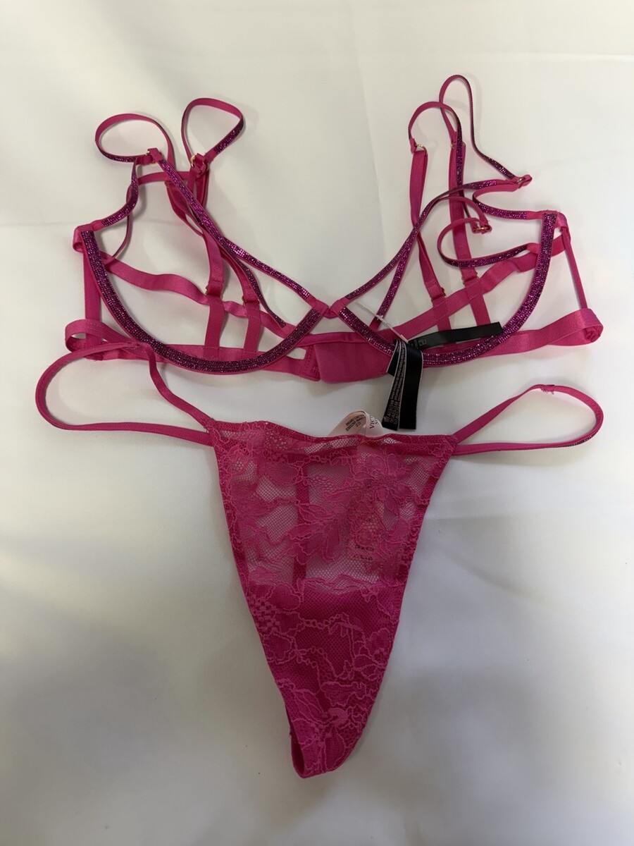 VICTORIA'S SECRET Low Cut Demi BRA STRING Thong Set Pink Fishnet Open Cup XL NWT