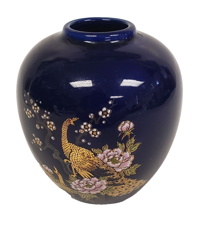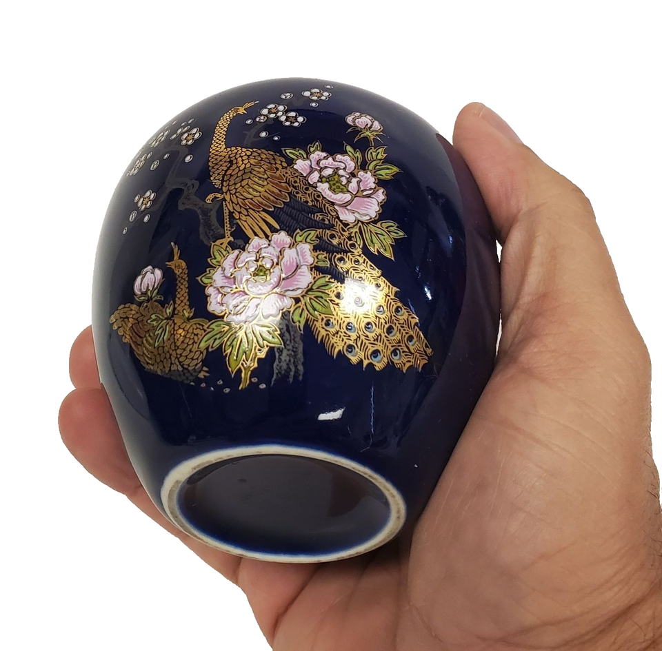 A stunning vintage Otagiri porcelain vase, crafted in Japan in the elegant Imari style. This petite 4-inch vase features a rich cobalt blue glaze adorned with a magnificent peacock and floral motif, accented in gold and warm jewel tones.