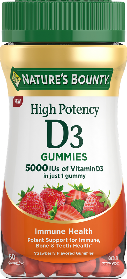 Did you know your body can harness the power of the sun to produce Vitamin D? Nature?s Bounty High Potency Vitamin D3 gummies contain the same form of Vitamin D that is naturally formed through exposure to sunshine! Vitamin D supports immune health and is critical for calcium absorption, which helps build and maintain strong bones in adults.* You?ll love the delicious natural Strawberry flavor of these easy-to-take Vitamin D3 gummies