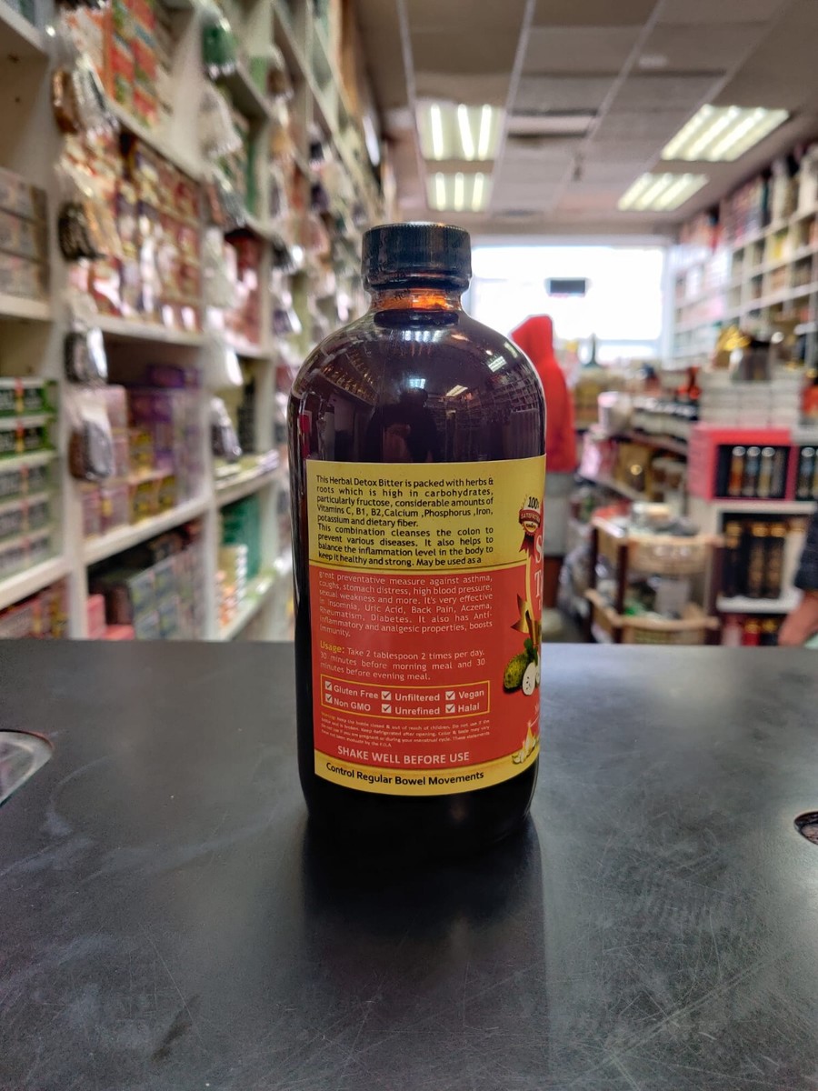 * This Herbal Detox Bitter is packed with herbs roots which is high in carbohydrates, particularly fructose, considerable amounts of Vitamins C, B1, B2, Calcium, Phosphorus, Iron, potassium and dietary fiber.