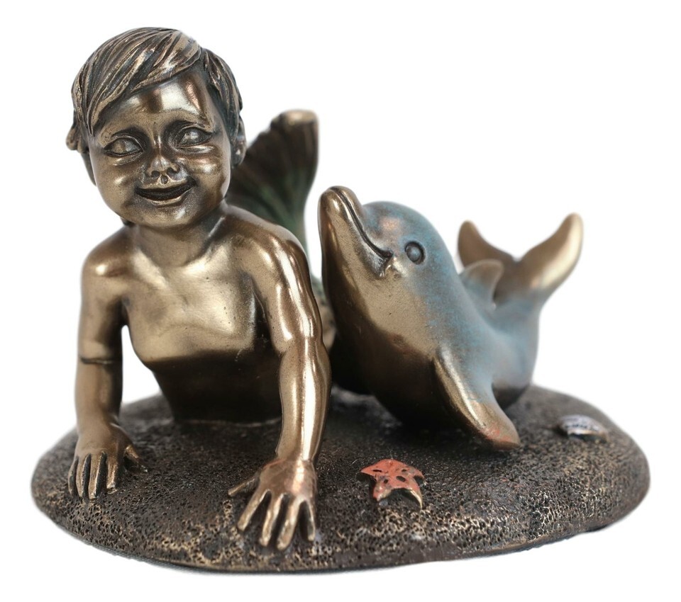 ? There is just something magical about this sculpture; an adorable merboy sits in the bottom of the ocean floor with his buddy dolphin. Seastars fill the ocean floor, bringing a nautical touch to the sculpture. It is the perfect baby shower gift, or as home decor for your vanity, countertop, shelf, tabletop or what have you!