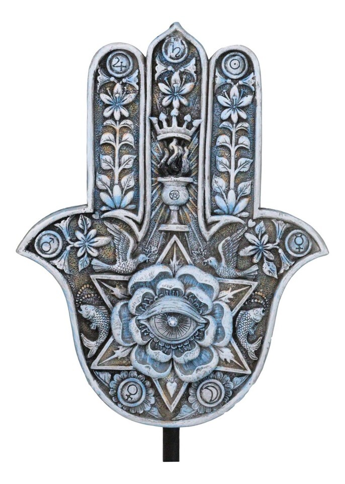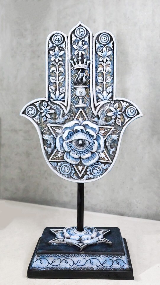 ? This Hamsa Palm With Star of David Sculpture is made of polyresin, individually hand painted and polished individually.