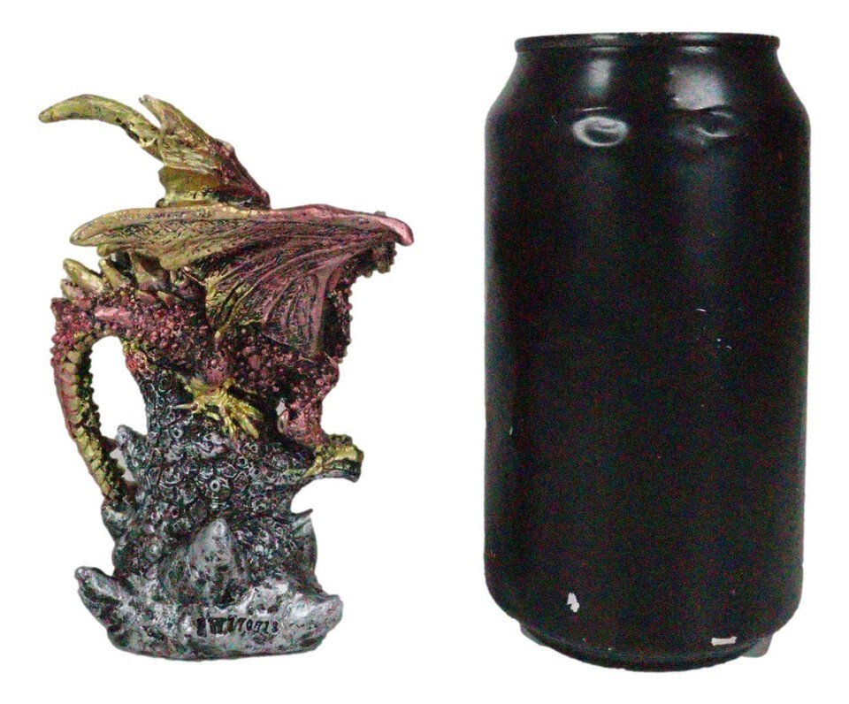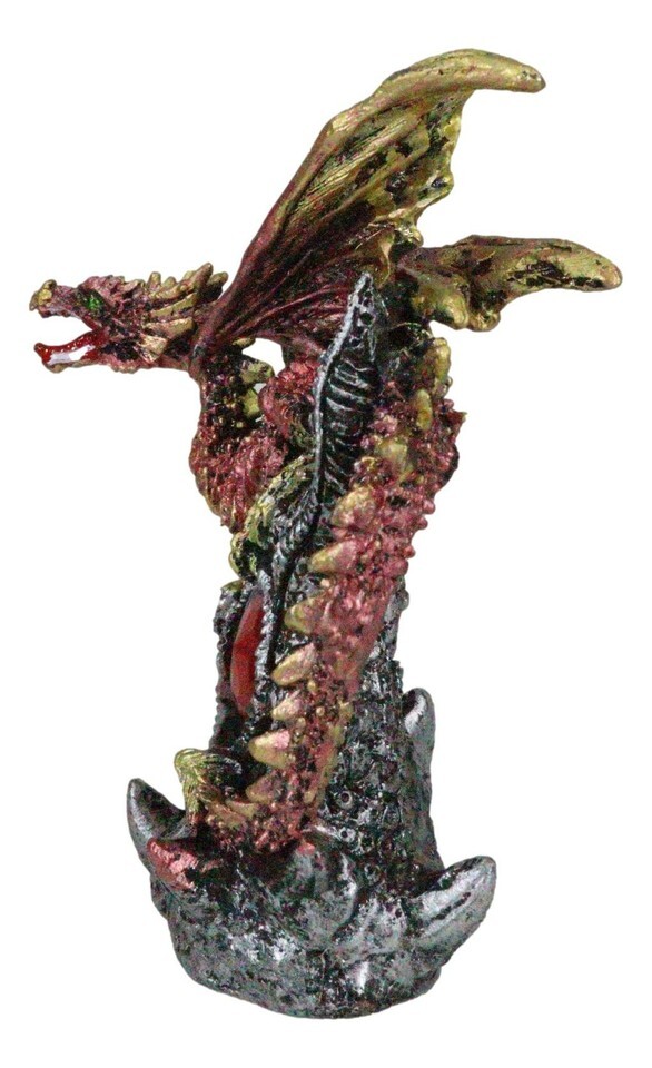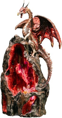 ? Standing over its shimmering treasure, this red dragon snarl in defense. The Red fantasy drake is fiercely protecting the red gemstone within a weathered remains of the tree of life. Hand painted to highlight each detail, this ferocious dragon is finished in a gorgeous metallic red tone accented by gold.