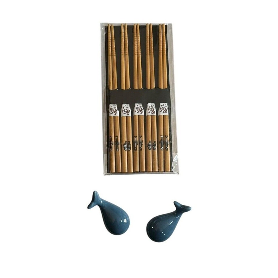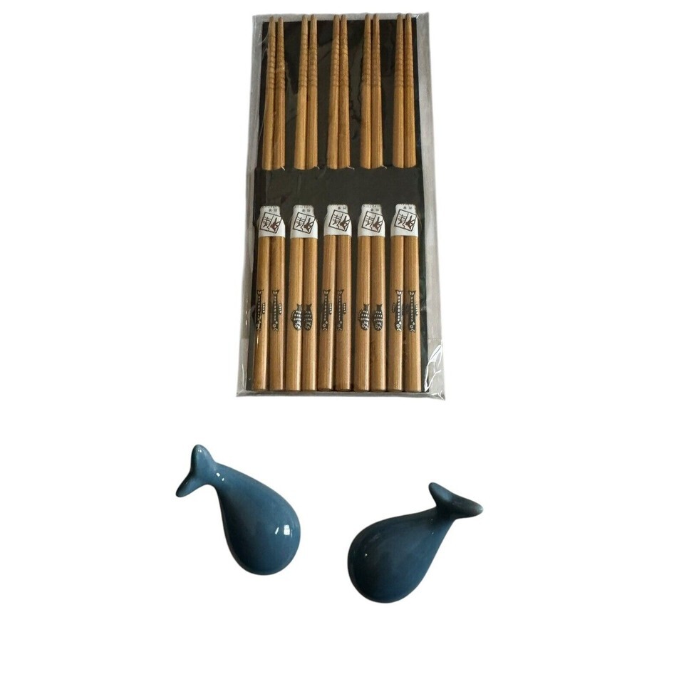 Set of 5 chopsticks (10 individual sticks total) and two whale chopstick holders. Colors may vary due to lighting and screen settings.