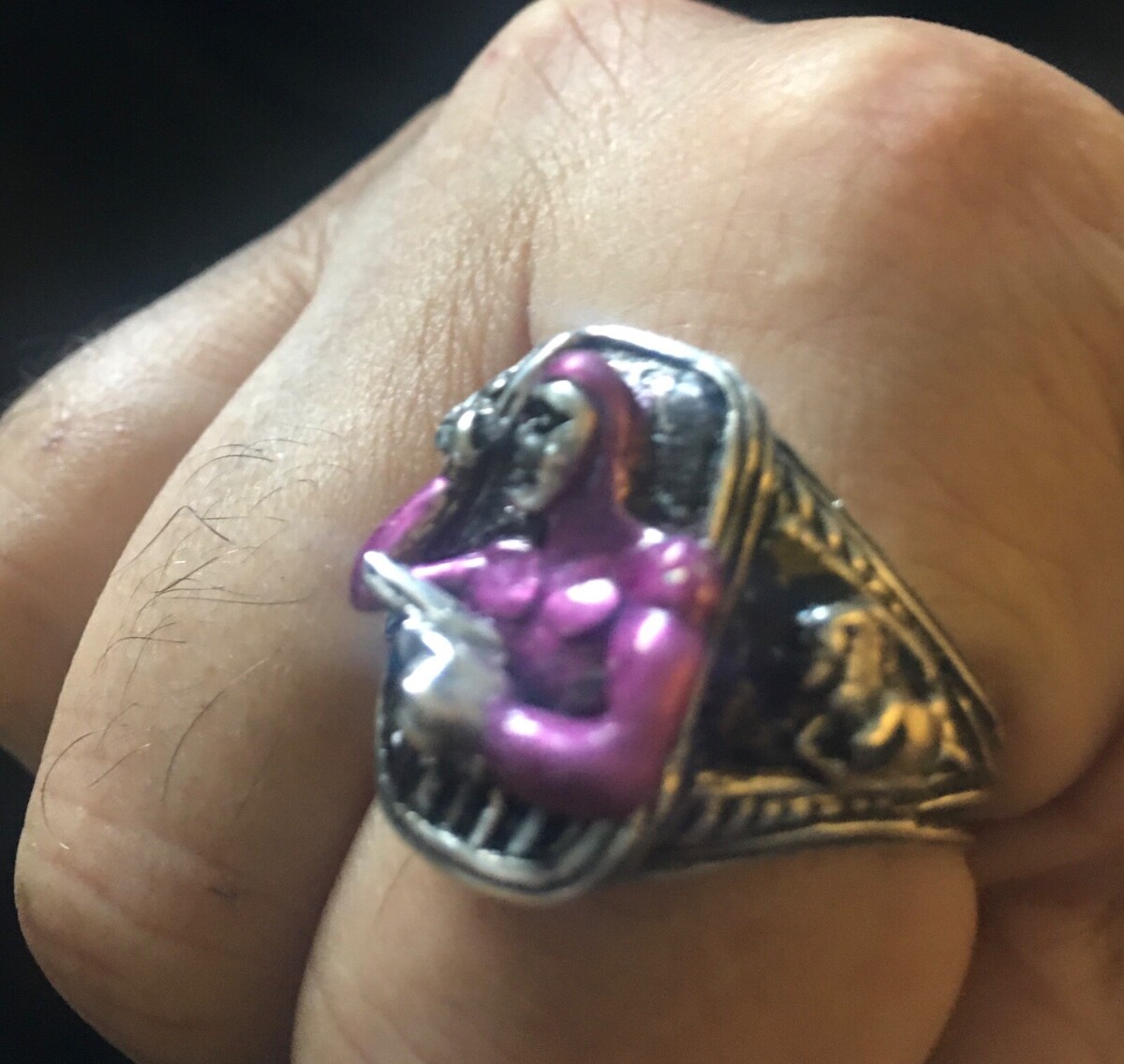 Purple Enameled 3-D sculpted Phantom top sporting twin .45's.Hero, side rearing horse accents x2,Sterling Silver Sterling silver worked fluted sides, and shank(bottom) HEAVYBUILT/USA