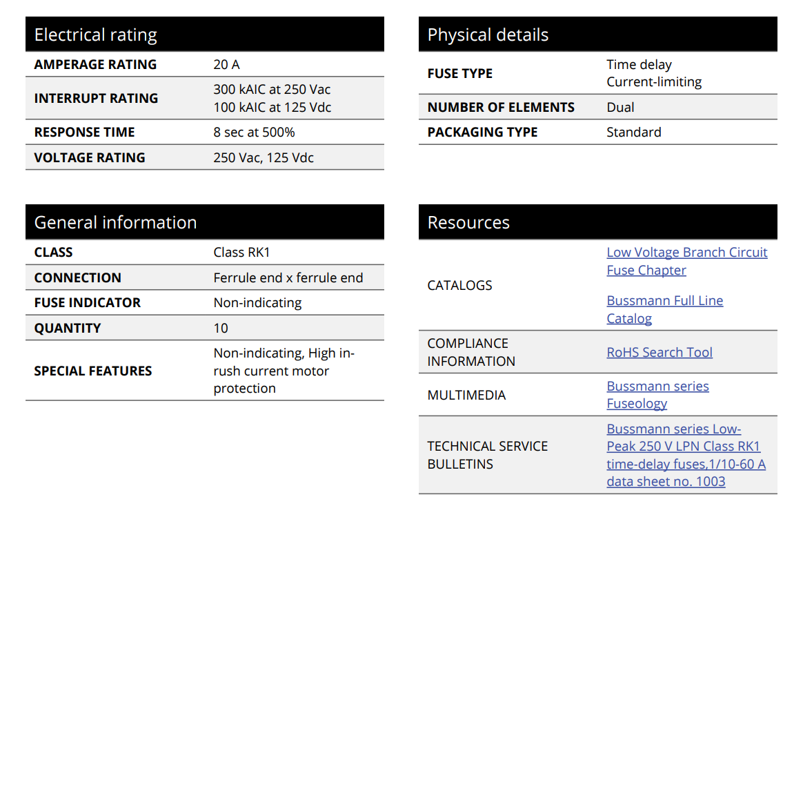 1 Piece - LPN-RK-20SP Bussmann Class RK1 Dual Element Time Delay Fuse 20A 250VAC 125VDC 300kAIC Ferrule End 0.56INX2IN-2