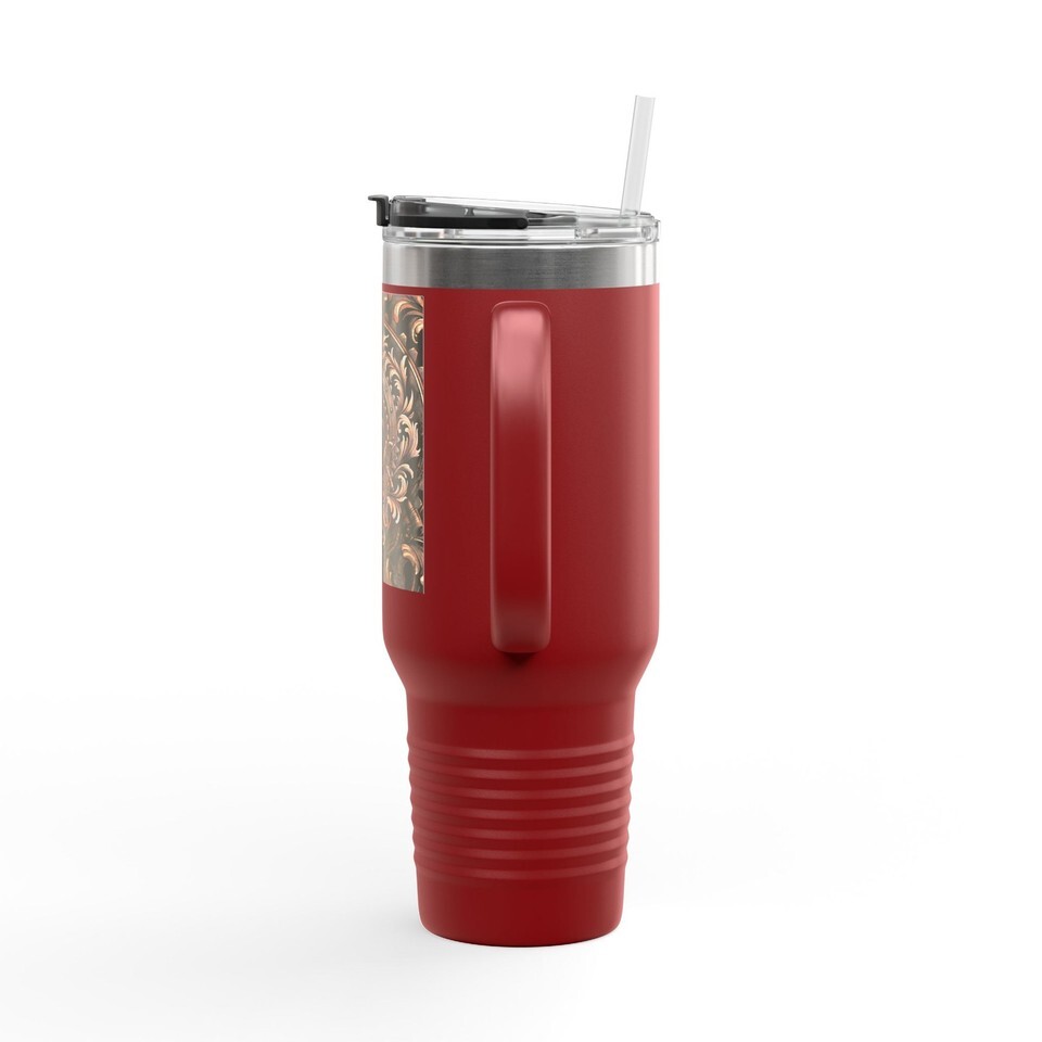 This 40oz insulated travel mug brings warm comfort and rugged style to long days on the road or slow mornings at home. Thick double-wall stainless steel locks in temperature for hours, while the ergonomic handle and large capacity carry more of your favorite brew ? coffee, tea, or chilled drinks ? so you don?t need to run back for refills. A secure, leak-resistant lid with straw keeps everything contained when you?re on the move, and the powder-coated finish adds grip and an understated matte look that won?t shout. The decorative printed panel hints at vintage, carved-wood textures, giving the mug a handcrafted, heritage vibe that pairs well with road trips, workshop mornings, or cozy porch sessions.