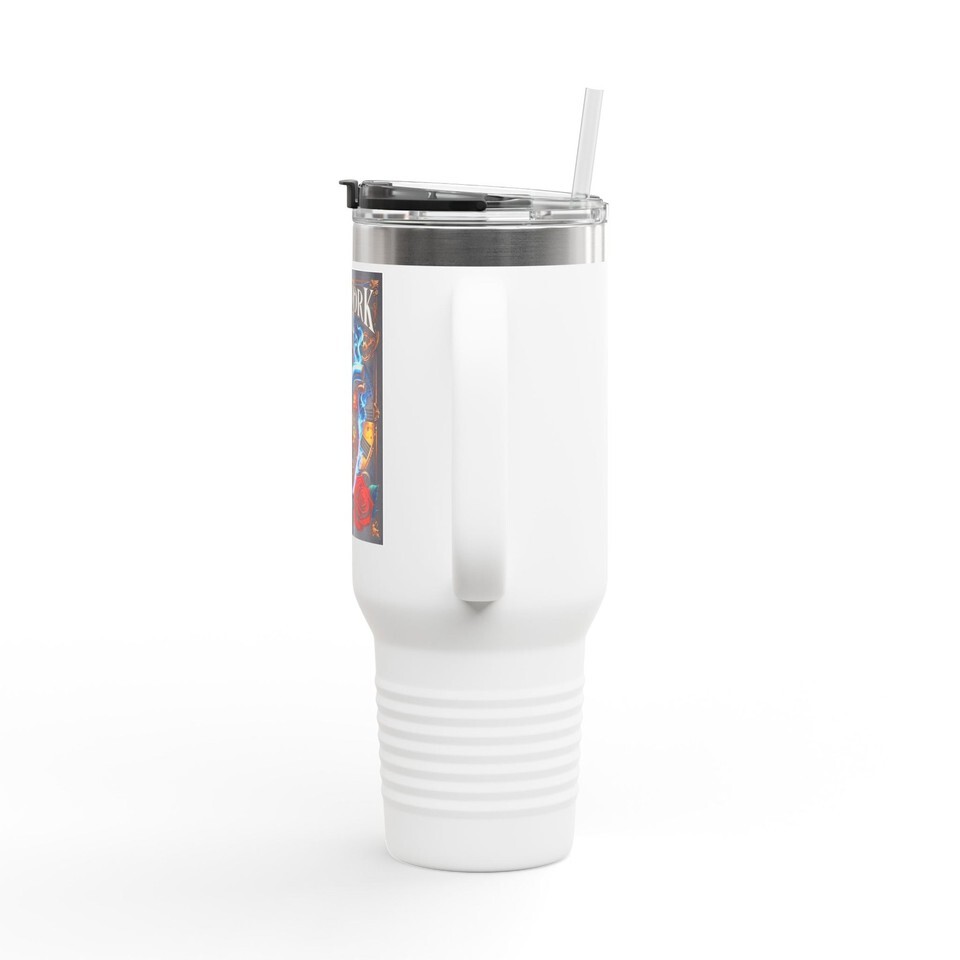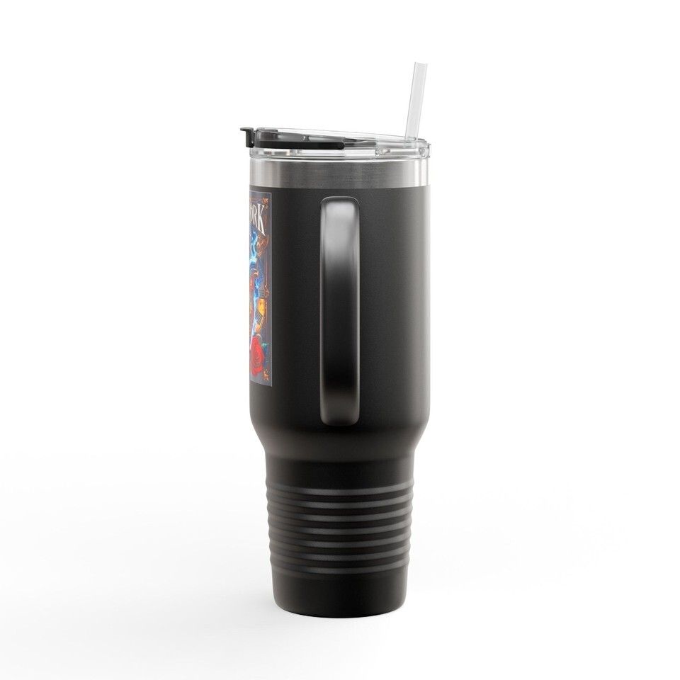 This 40oz insulated travel mug holds a day?s worth of coffee and keeps it at the right temperature while you move. Thick double-wall stainless steel locks in heat or chill for hours. The ergonomic handle and included straw make long drives, late rehearsals, or workshop shifts easier on your hands. A powder-coated finish gives a tactile, non-slip feel and the printed panel showcases bold artwork without sacrificing durability. It seals tight with a leak-resistant lid and is BPA-free?built to be lived in and used, not tucked away.