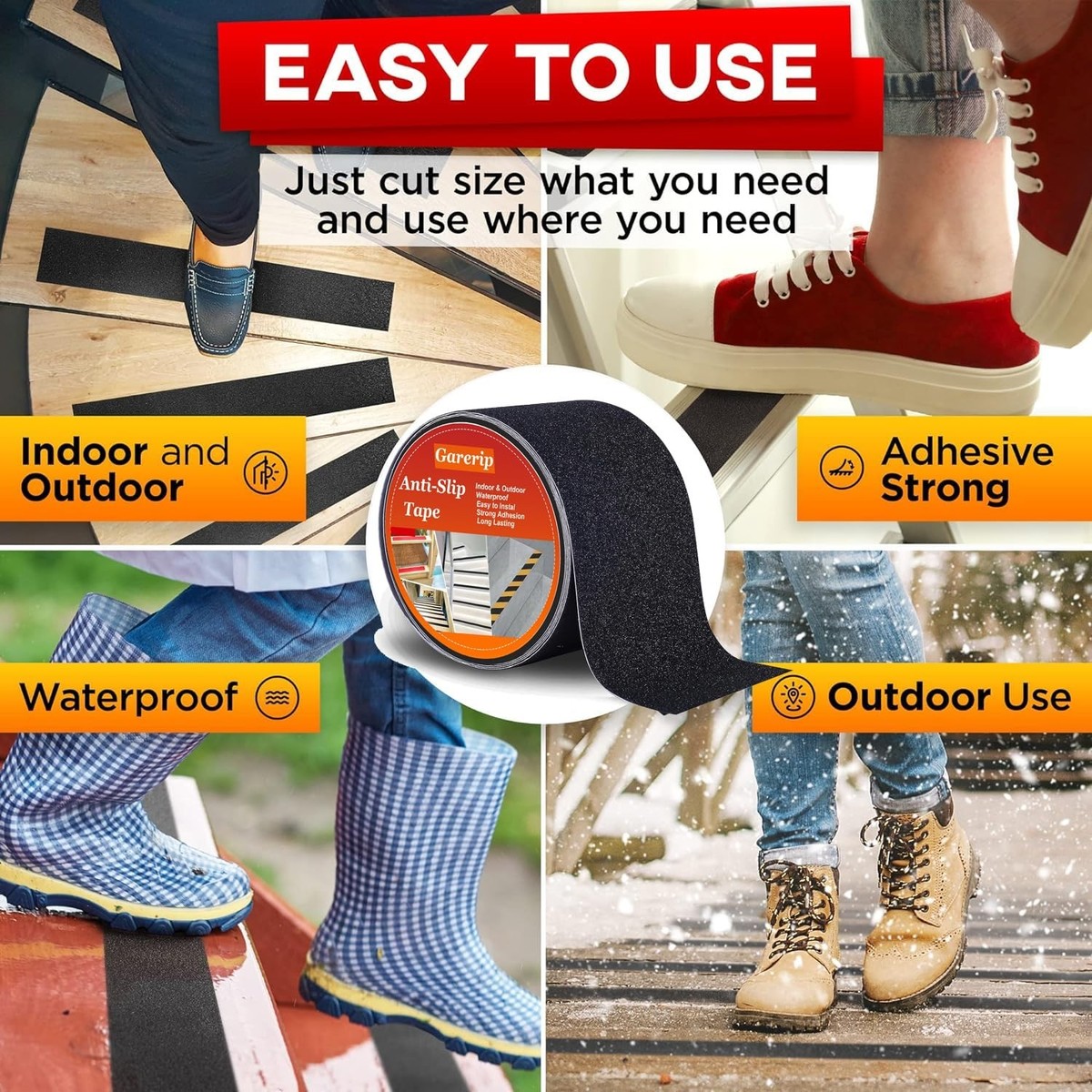 : Suitable for rain, snow, frost, sunlight, water, and hot weather, the PVC base layer also withstands temperatures (-20ยบc to 60ยบc / -4 F to 140 F). No cracking, peeling, disintegrating using in hot or cold weather, perfect for INDOOR and OUTDOOR all year around. Compared to ordinary tape, this General Anti-Slip Tapes are Easier to remove, no residue, Durable for heavy foot traffic, Water resistant, Recyclable, Stronger adhesive.