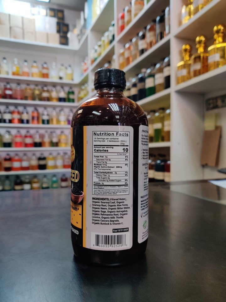 Our Super Black Seed Bitter Formula is traditionally used to optimize healthy Kidney function. Many studies shows that black seeds (Nigella Sativa) has thousands of other health benefits, due to its bioactive compound Thymoquinone (TQ).