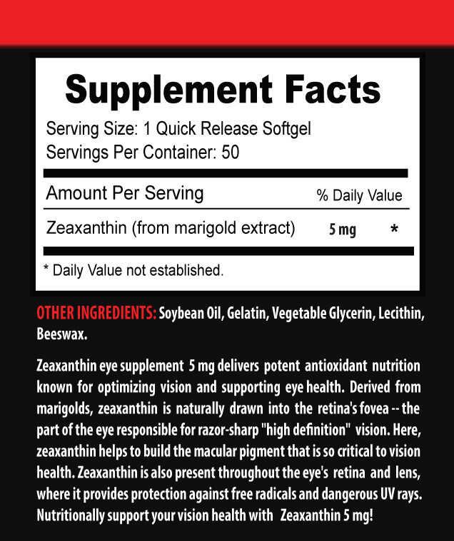 Zeaxanthin eye supplement 5 mg delivers potent antioxidant nutrition known for optimizing vision and supporting eye health. Derived from marigolds, zeaxanthin is naturally drawn into the retina's fovea -- the part of the eye responsible for razor-sharp "high definition" vision. Here, zeaxanthin helps to build the macular pigment that is so critical to vision health. Zeaxanthin is also present throughout the eye's retina and lens, where it provides protection against free radicals and dangerous UV rays. Nutritionally support your vision health with Zeaxanthin 5 mg!