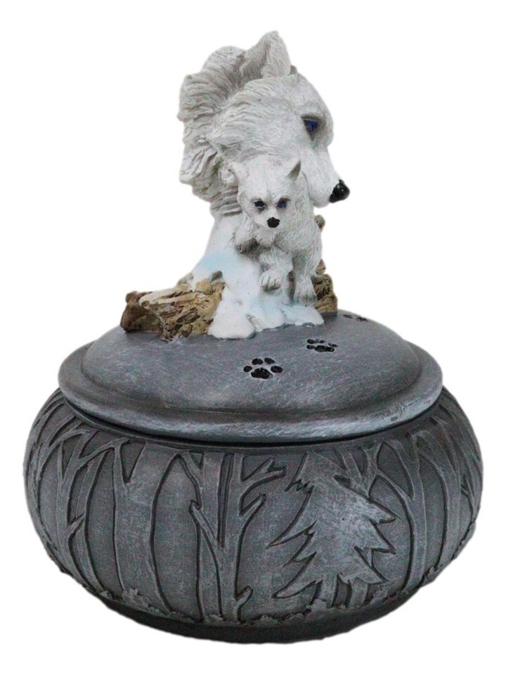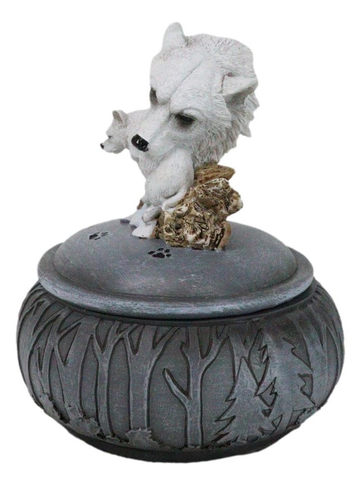 ? This Albino White Wolf With Pup Round Jewelry Box Figurine is made of designer polyresin, individually hand painted and polished individually.