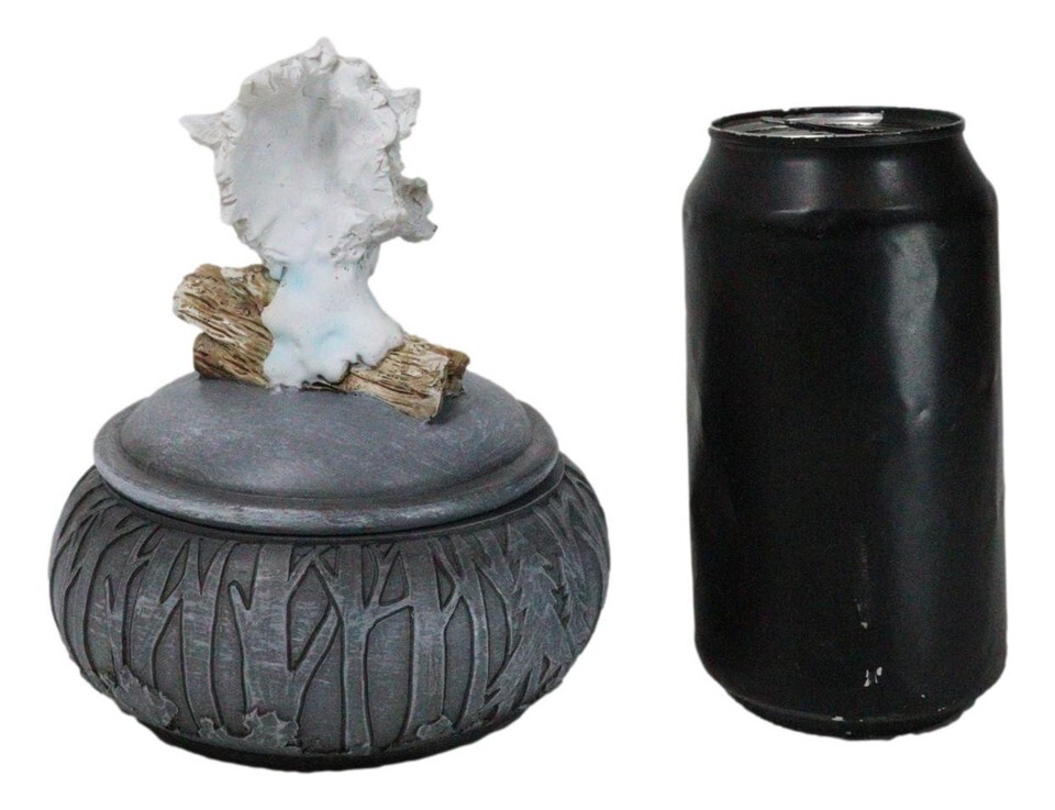 ? This Albino White Wolf With Pup Round Jewelry Box Figurine measures approximately 4.75" in diameter and 5.5" High. It weighs about 1.25 pounds.